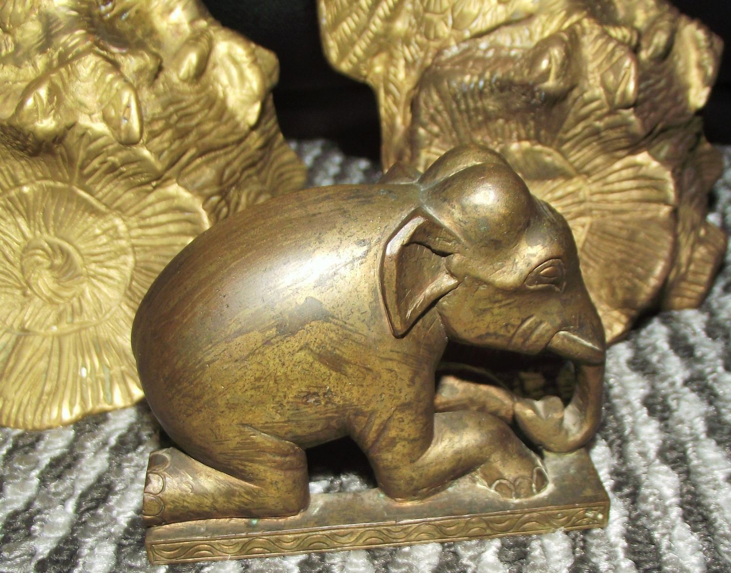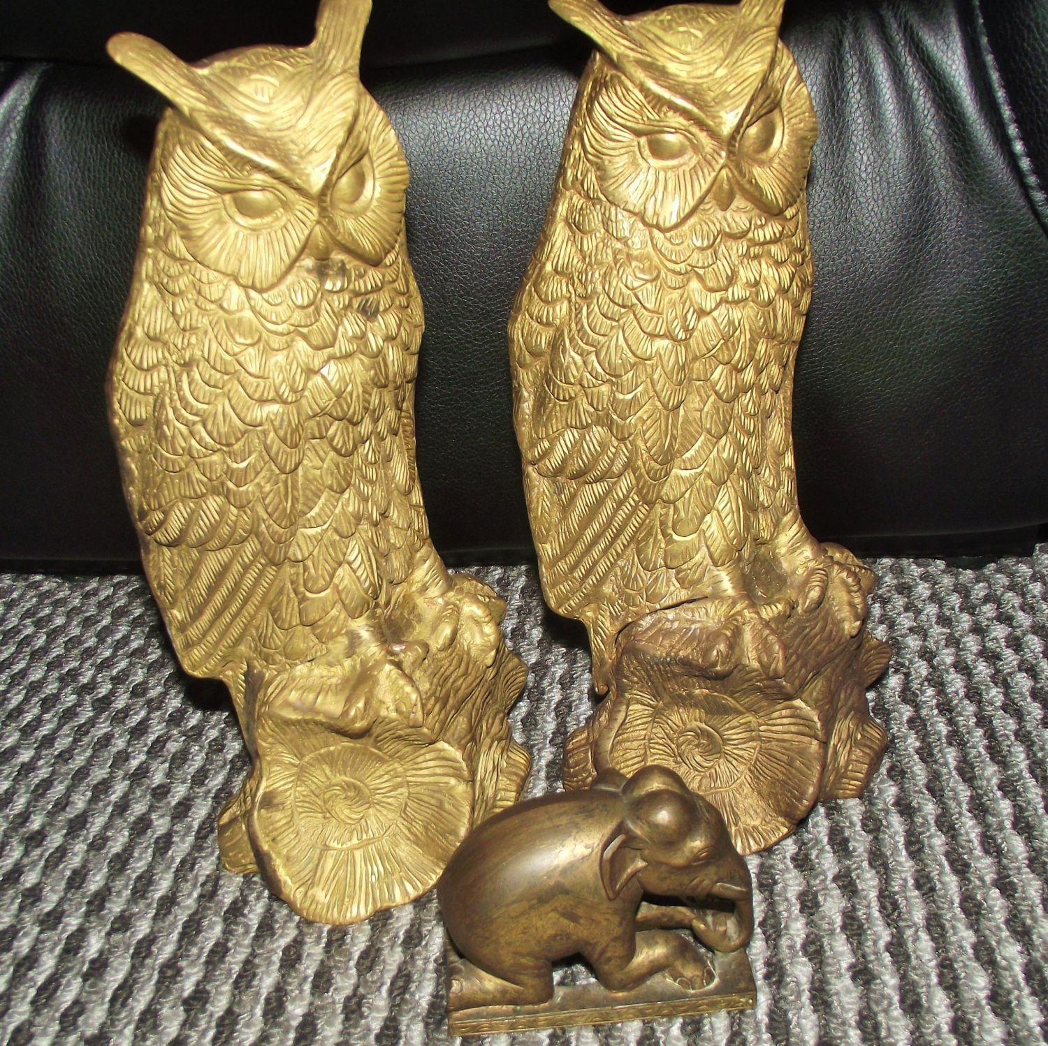 Pair of large10 tall ,heavy vintage cast brass owls stood on a tree stump + small heavy brass Indian elephant paperweight