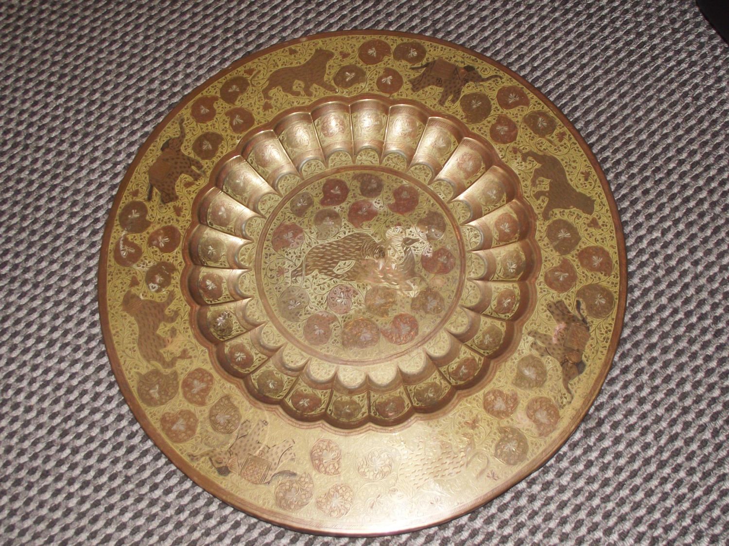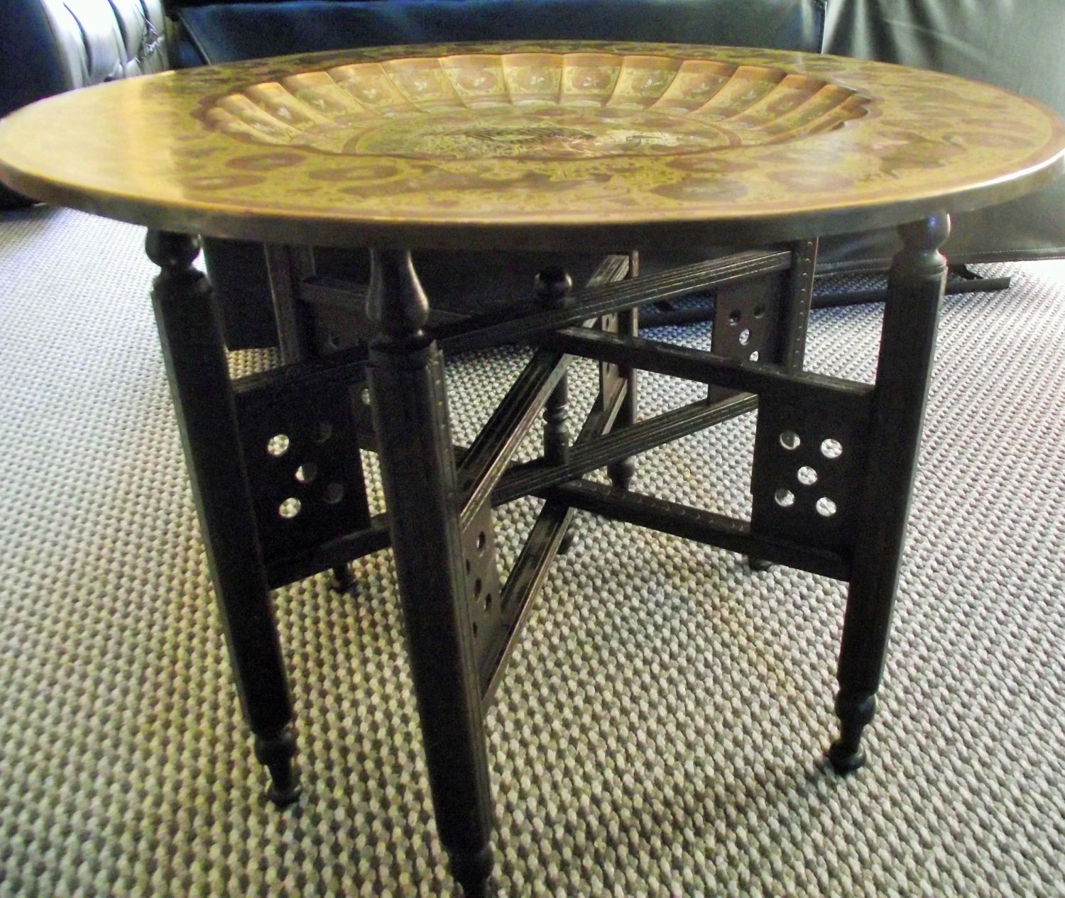 Good quality antique Indian dished topped folding legged table. Large circular dished top with fluted edges decorated with tigers and elephants among foliage central cartouche tiger and deer highlighted in a gold colour lacquer. Top 23cm diameter height 46cm approx.