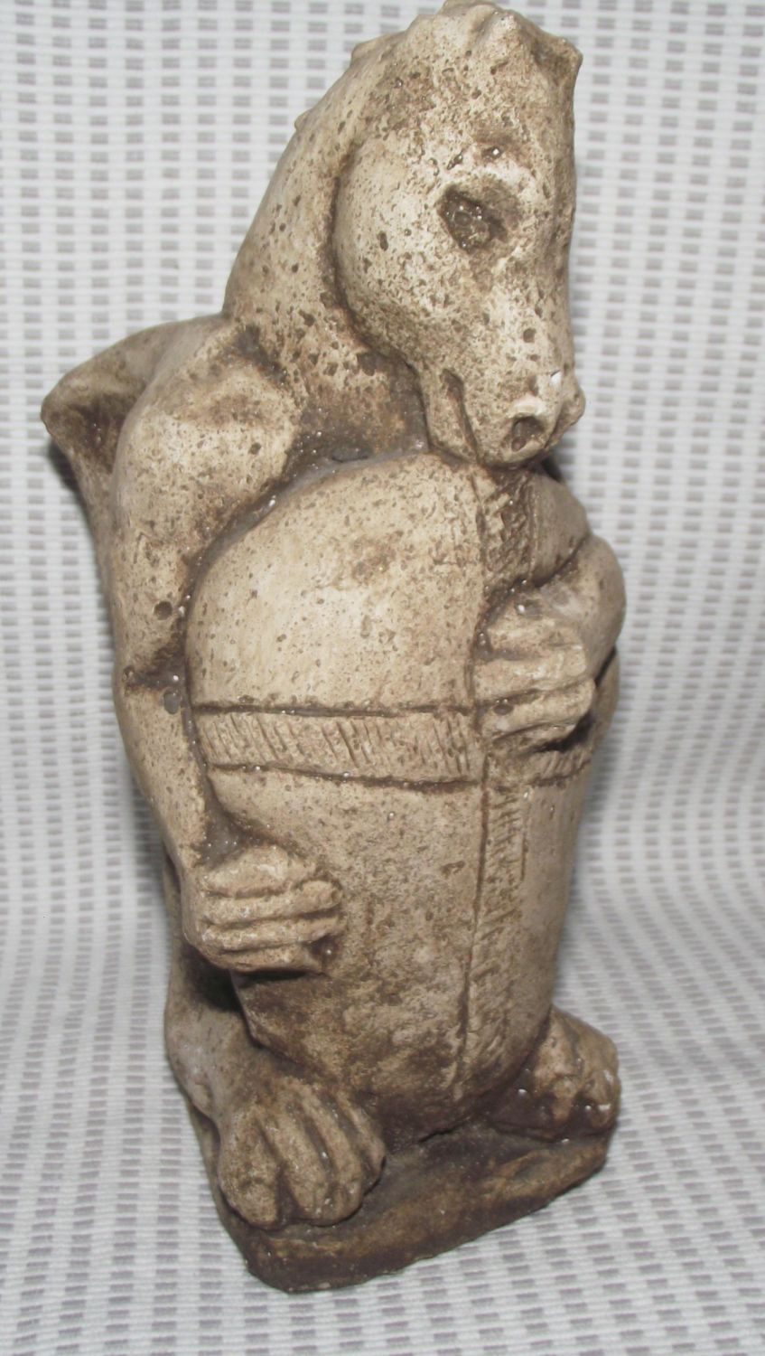 Unusual heavy solid pre cast stone model of a griffin with serpents tail and wings with a dragon head holding a shield 9 tall approx.