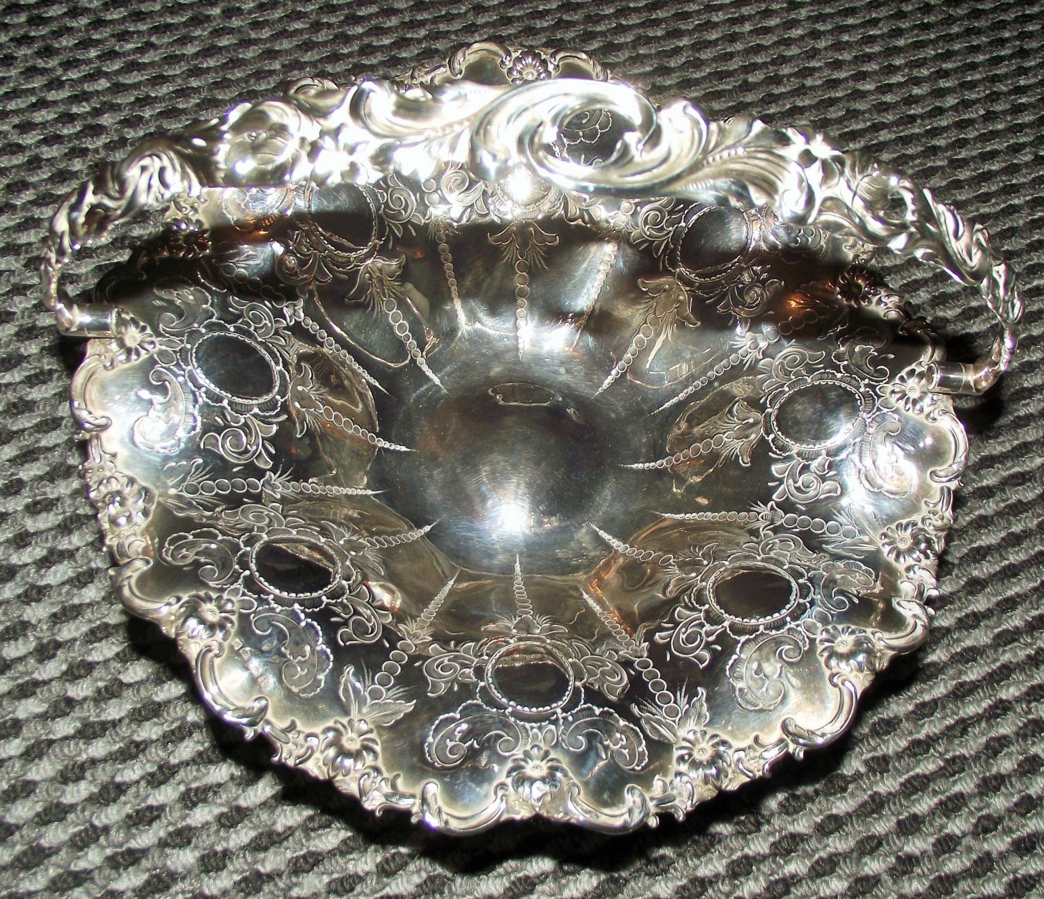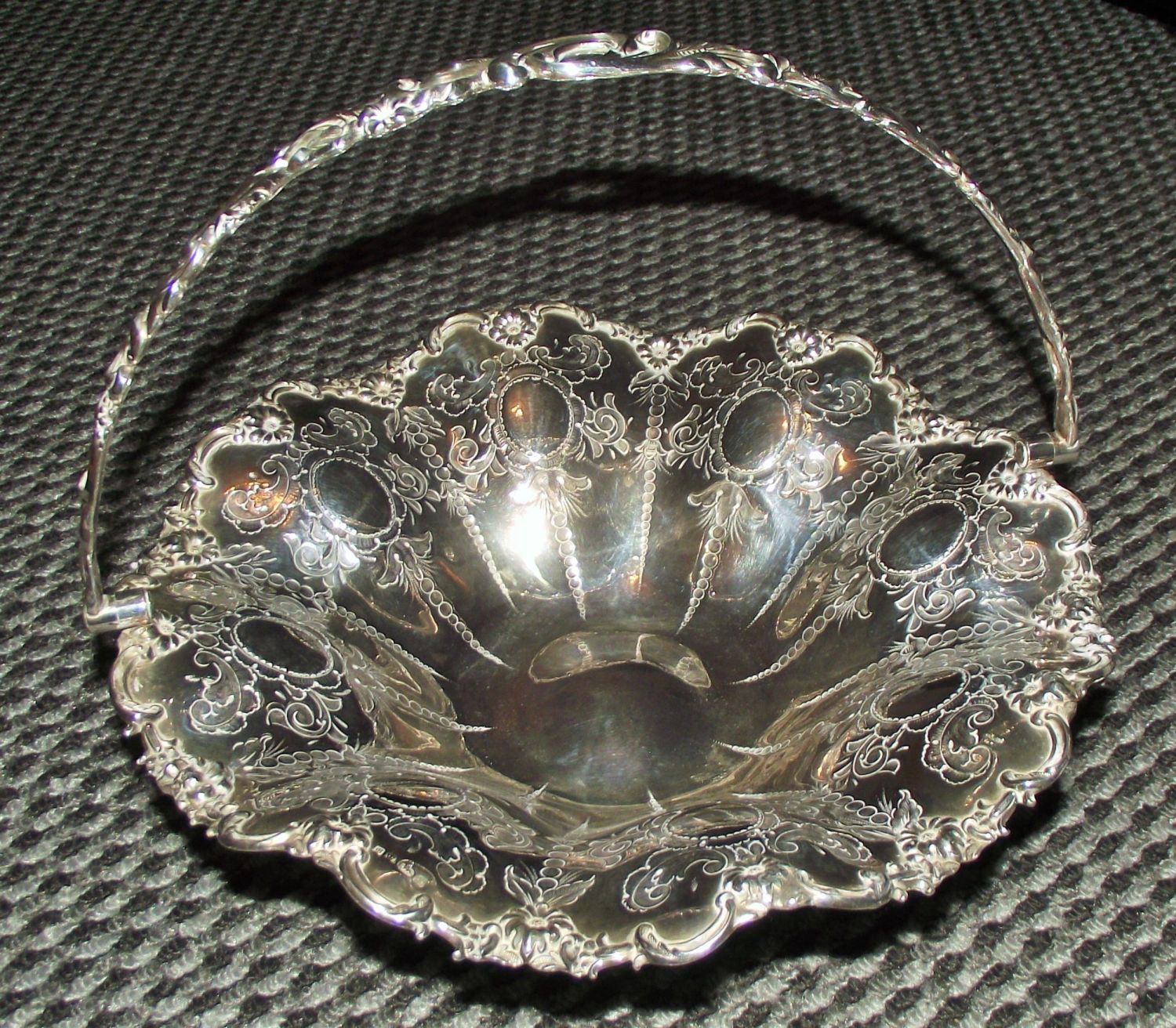Good quality silver pedestal plated Swing handle tray John Sherwood & sons 1865/1913 decorated with vacant cartouches surrounded with vines handle decorated with swirls and vines 12 diameter & 12 tall to top of handle