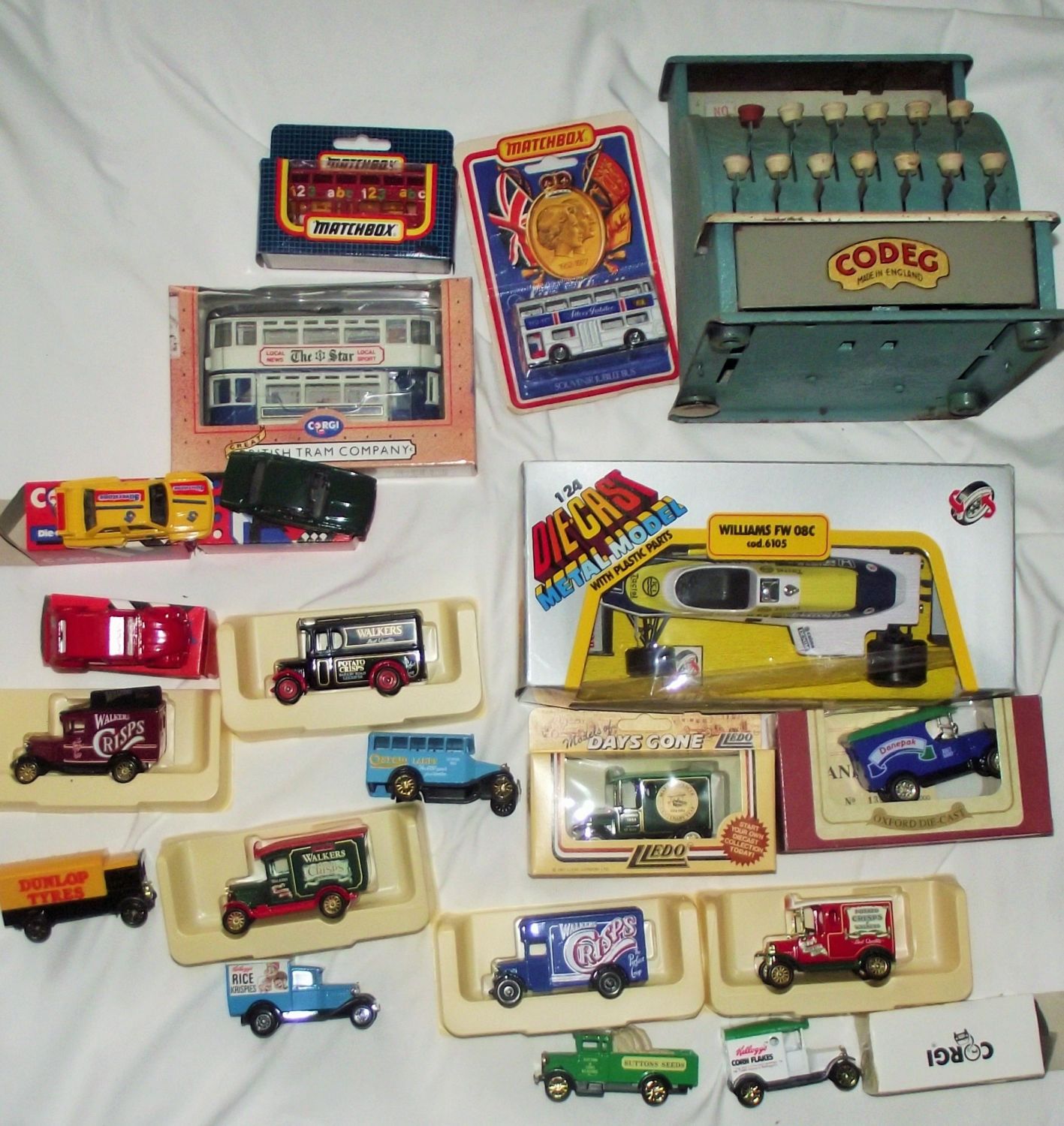 Childs vintage Codeg cash register + selection of Corgi, matchbox & days gone by collectors toys