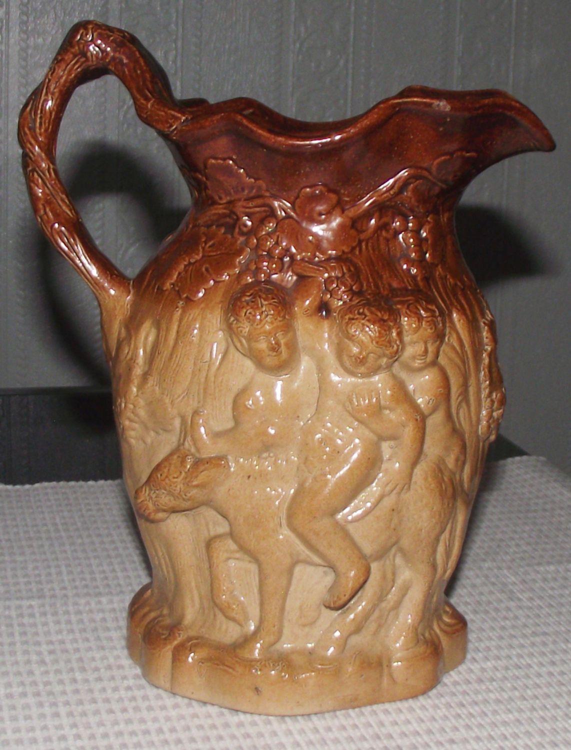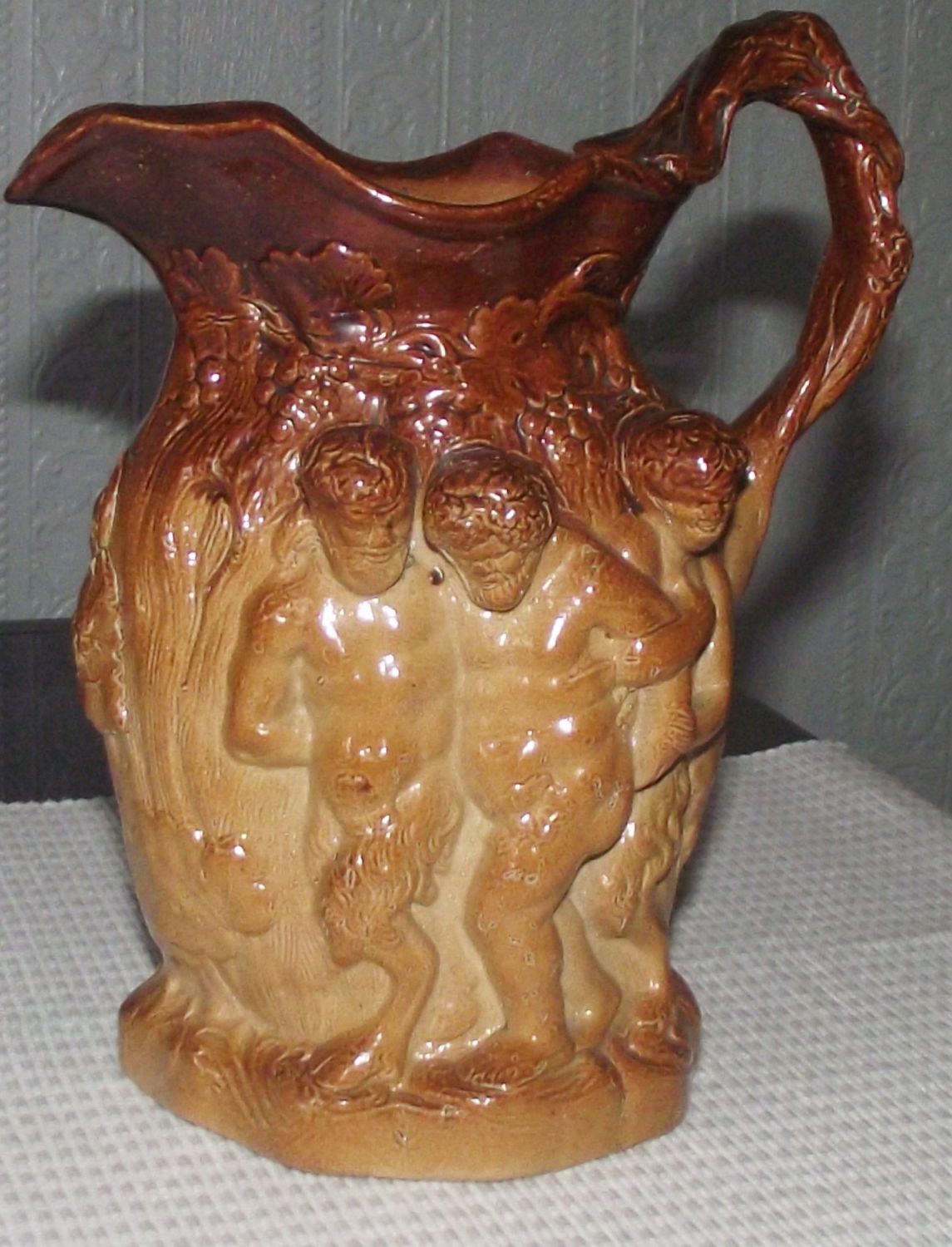 Rare stoneware Brampton ware Silenus ewer, handle formed as a vine covered branch with 3 figures to one side mythical figures 2 with fawn legs. Other side 3 putti riding a mule. 7 approx.