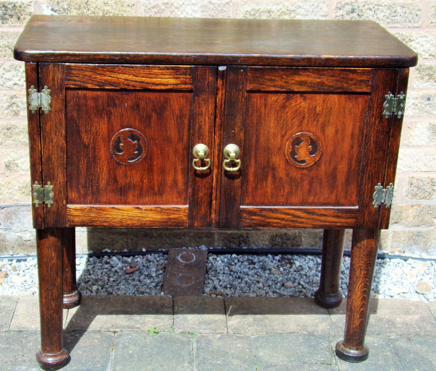 Small Antique oak side table- cabinet raised on solid tapered legs with 2 door front 29L x 26H X 14D
