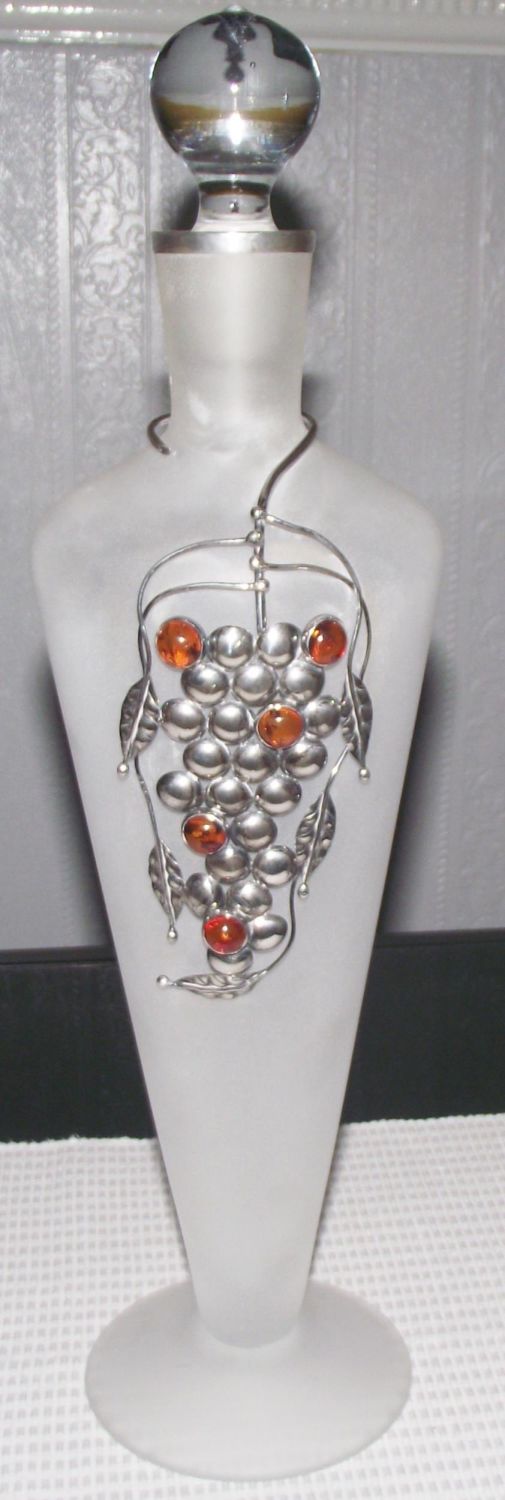 Large frosted glass wine decanter tapered body with silver & amber grapevine overlay design 16 approx.