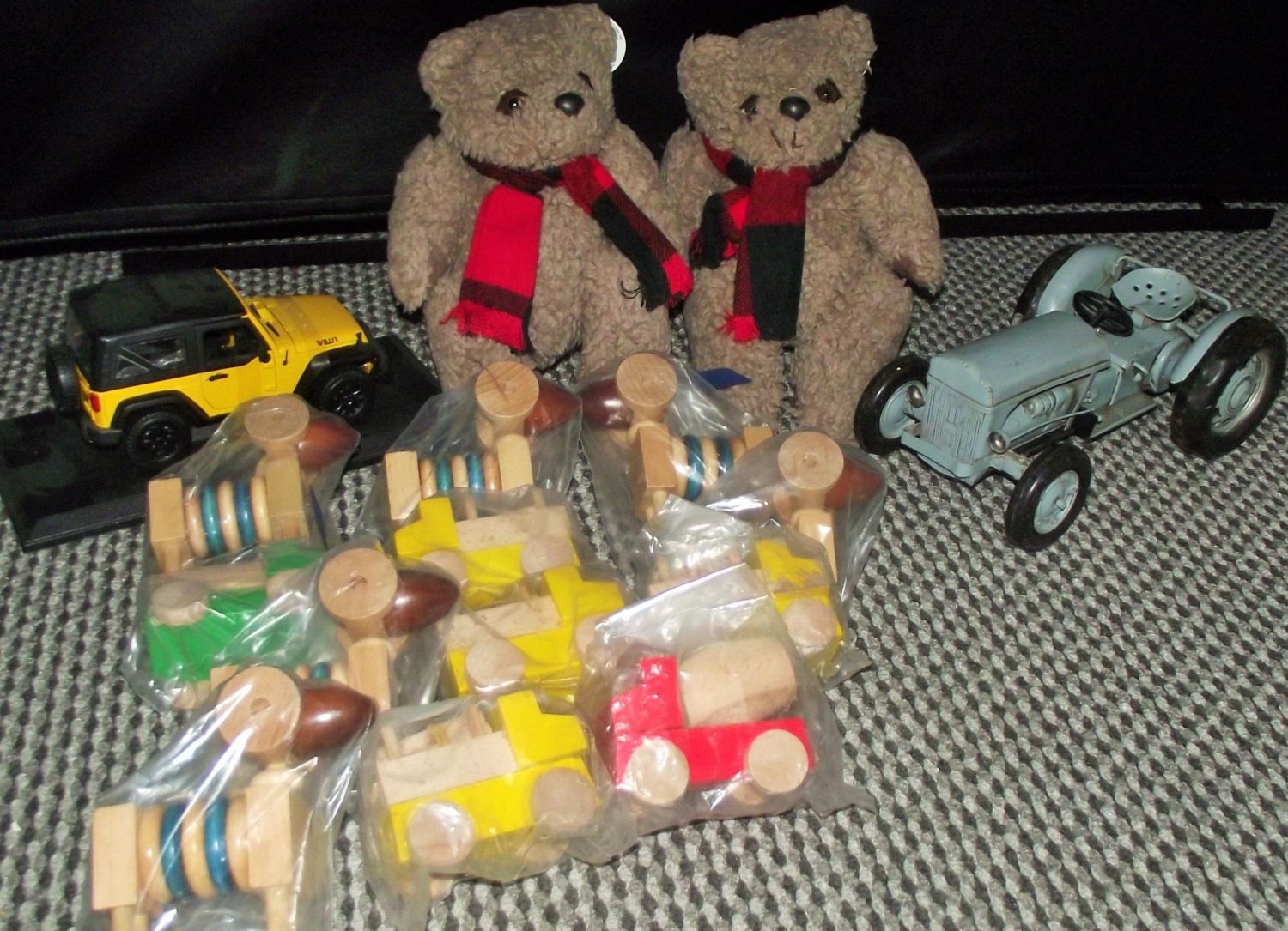 1x tin plate grey Ferguson tractor + Maisto model Jeep Wrangler + 2x Salco teddy bears+ selection of 12 new childrens wooden toys inc cement mixer , dogs etc. all in original packaging