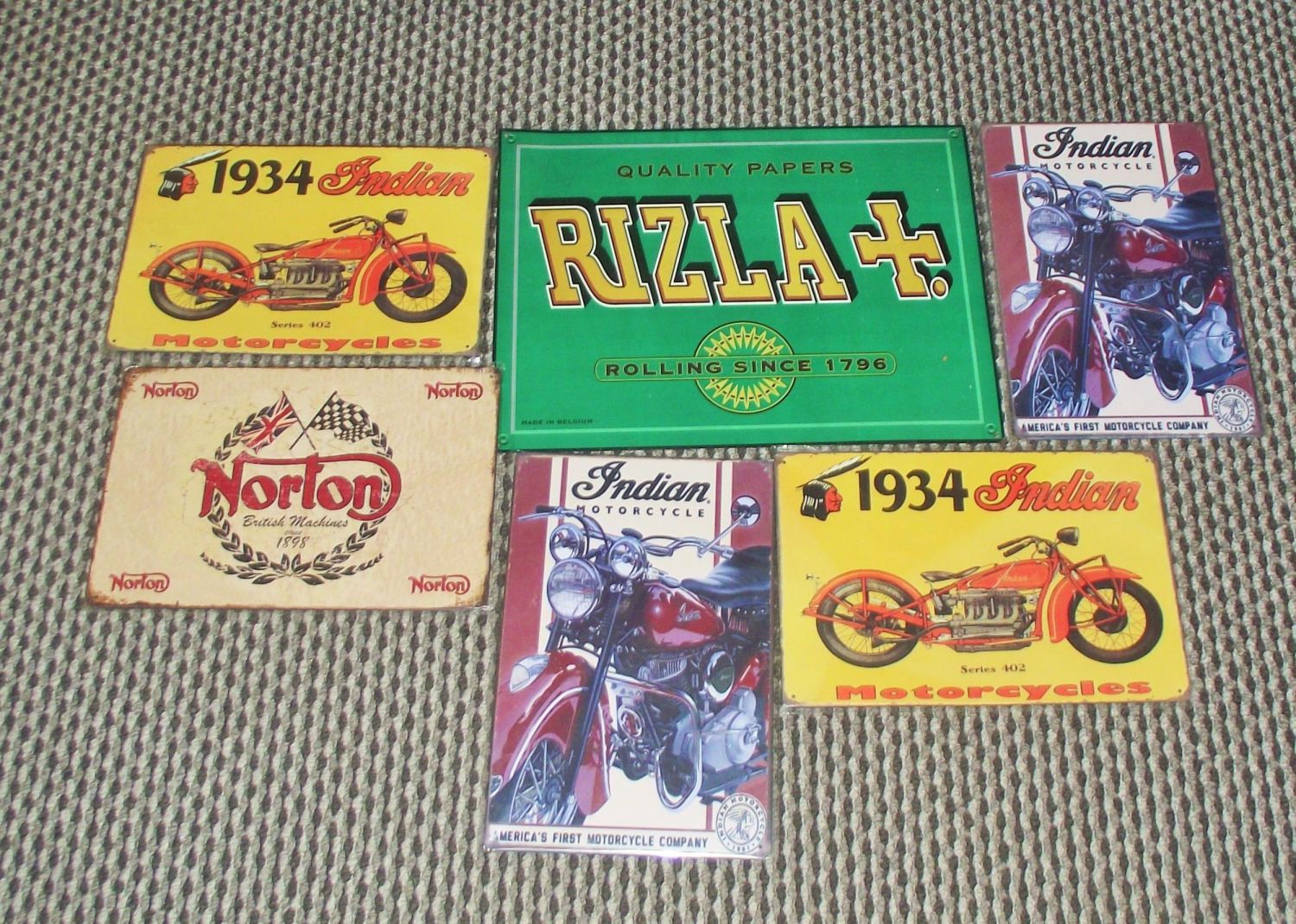 Selection of reproductions enamel style signs of various bygone motorbikes & Tobacco. Largest Rizzla 15.5×11.5 , others still in sealed packets