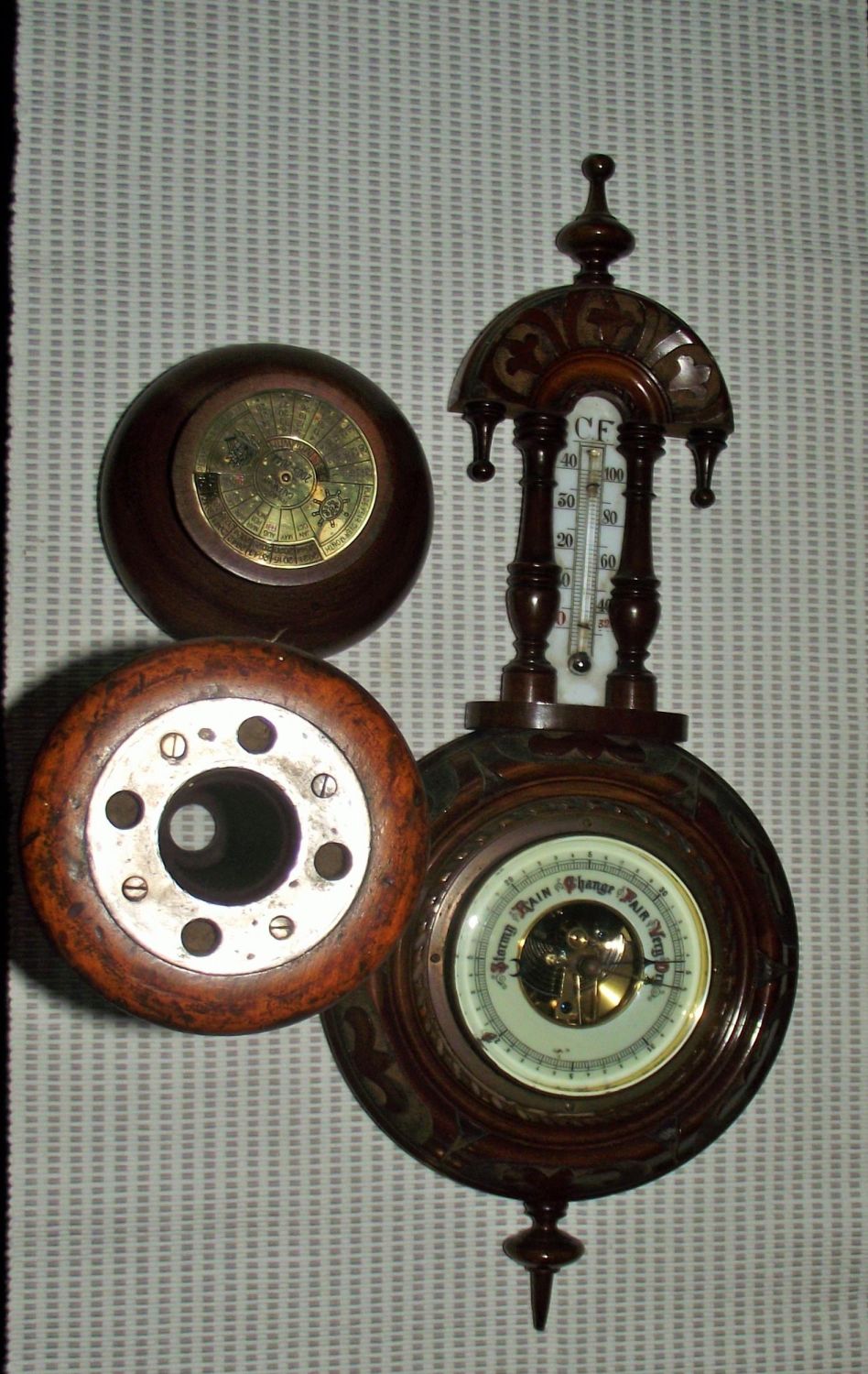 Victorian Barometer/ thermometer with turned supports 19 approx. + Brass & wooden 2005/2044 desk calendar + unusual large vintage factory cotton machine bobbin