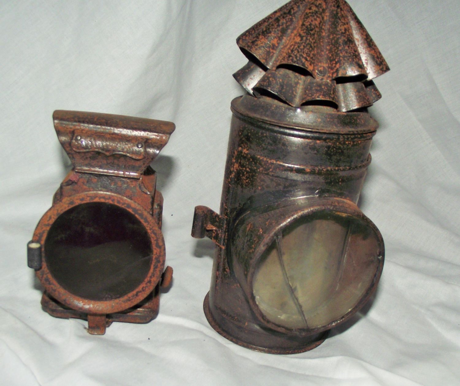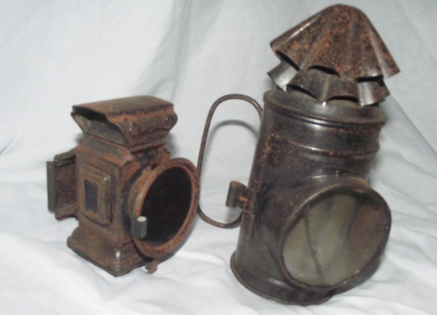 Vintage Carbide Joseph Lucas Ltd OIL Bicycle LAMP Circa 1910 + hand held railway signalling lamp circa 1930/40s with ( cracked glass lens )