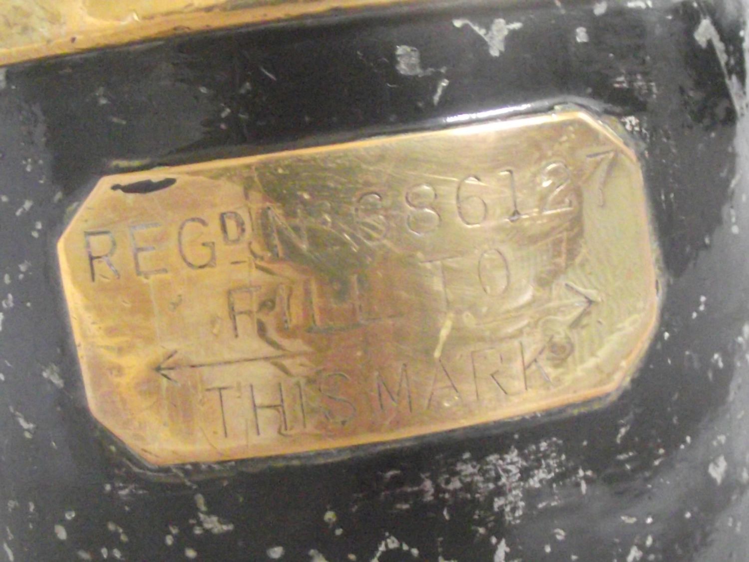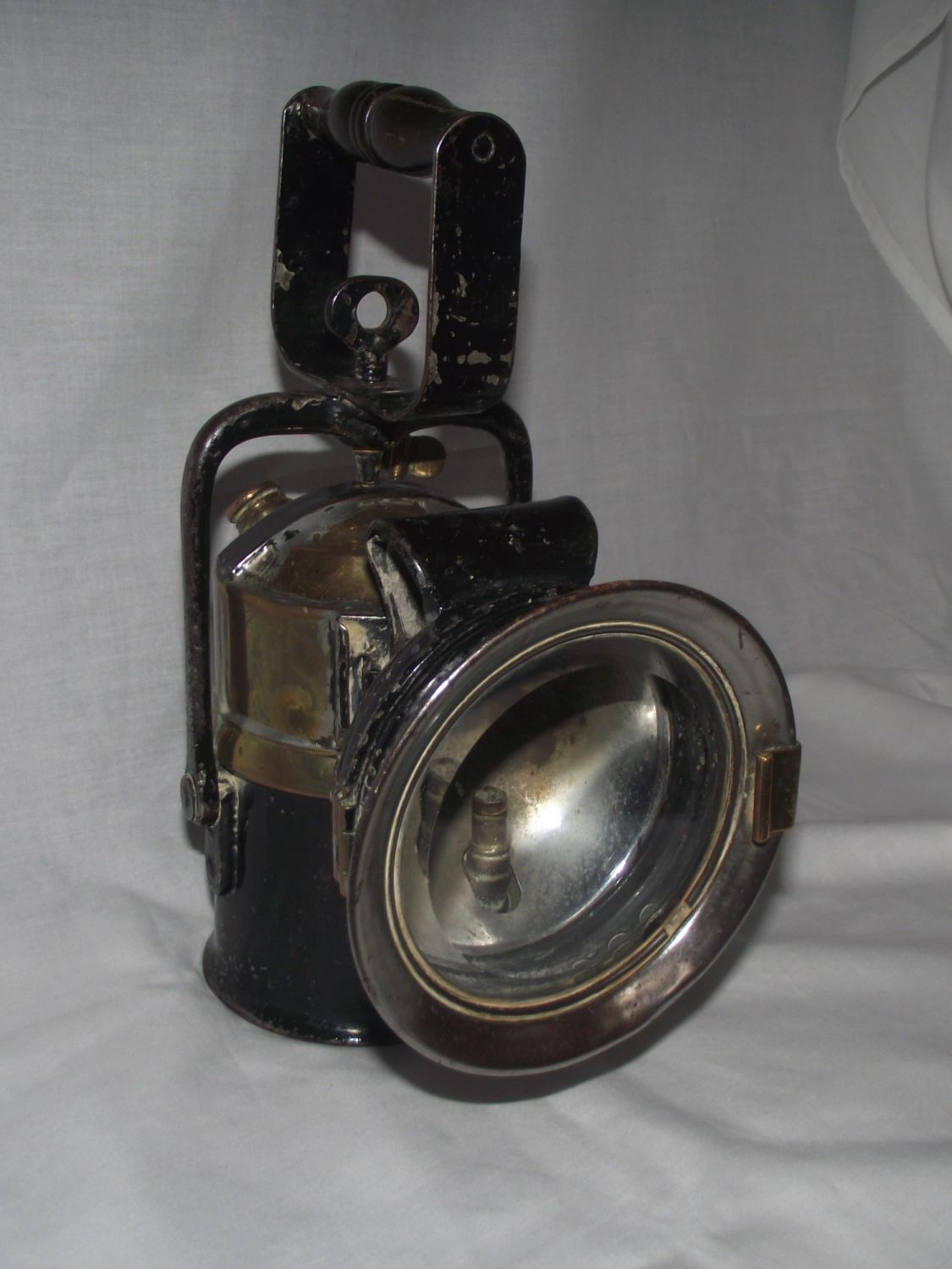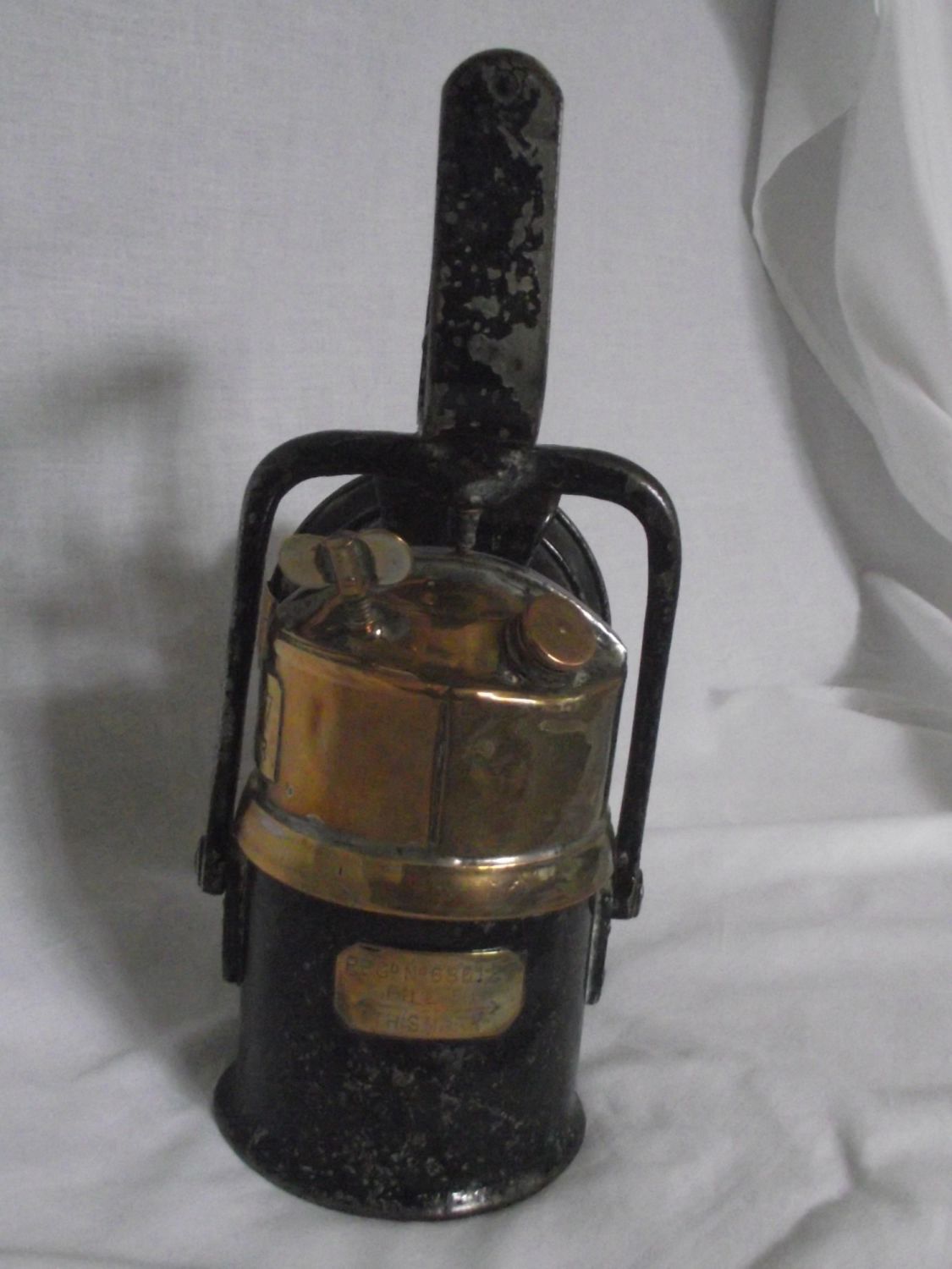 An unusual early Railway Carbide Lamp. Clearly stamped ”C&W 167 Deepcar to the lower section of the circular steel body brass top and steel bracket carrying handle. Brass label with reg No 686127 fill to this mark