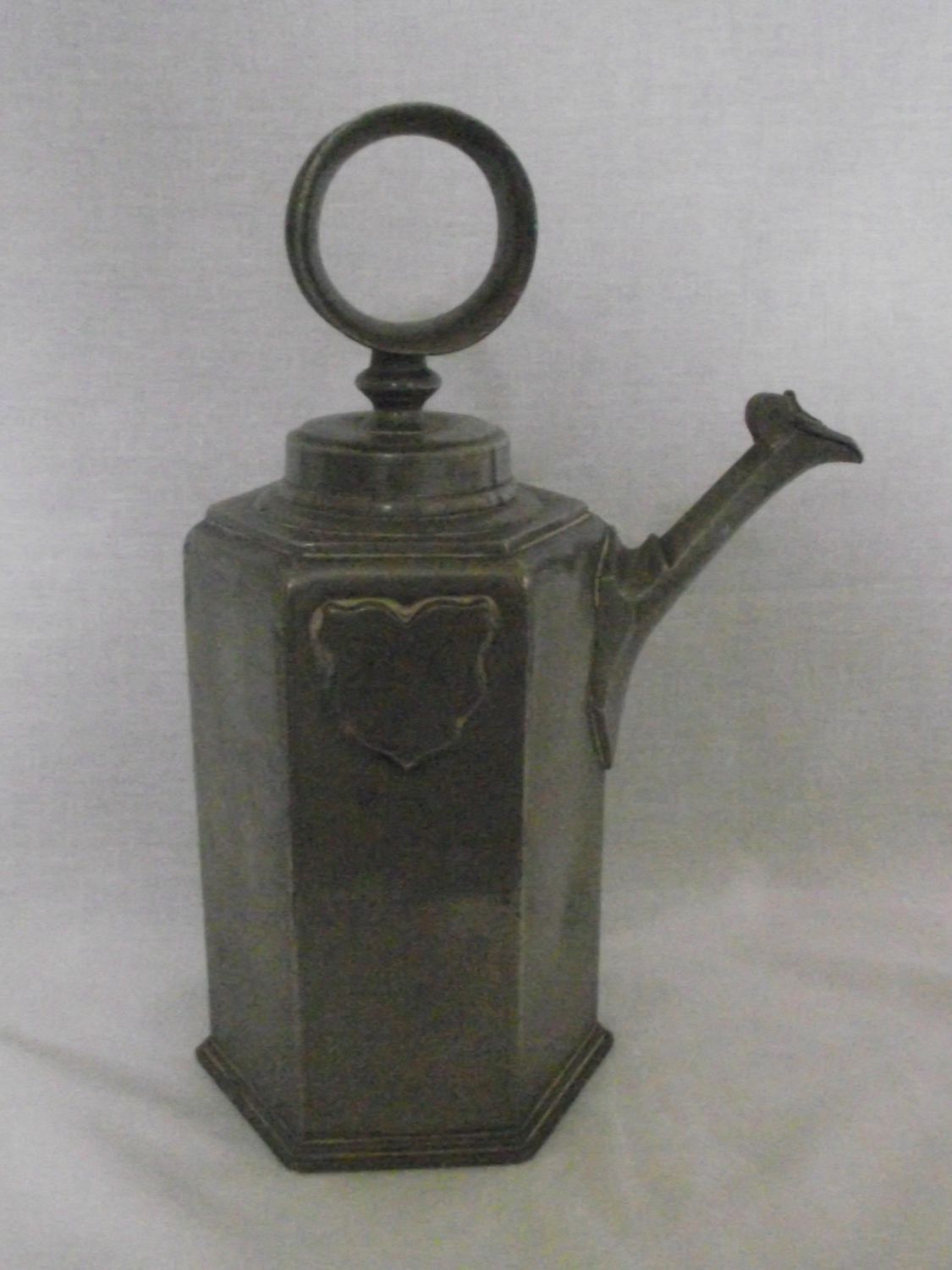 Rare antique pewter wine canister/ flagon late 18th / Early 19th century with hexagonal body , finial & spout large ring handle to the top