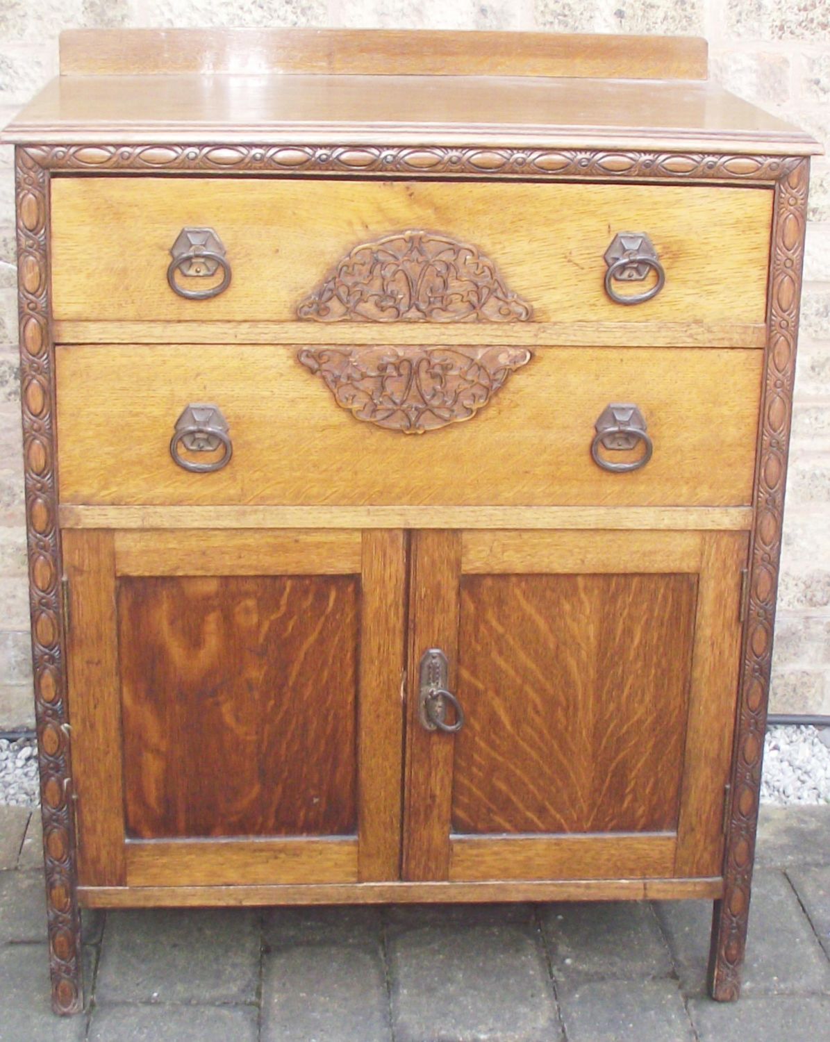 Lovely 2 draw vintage oak unit. 2draws above 2 doors, small raised back, detailed fret work to draw fronts 35x 28x 17 approx.