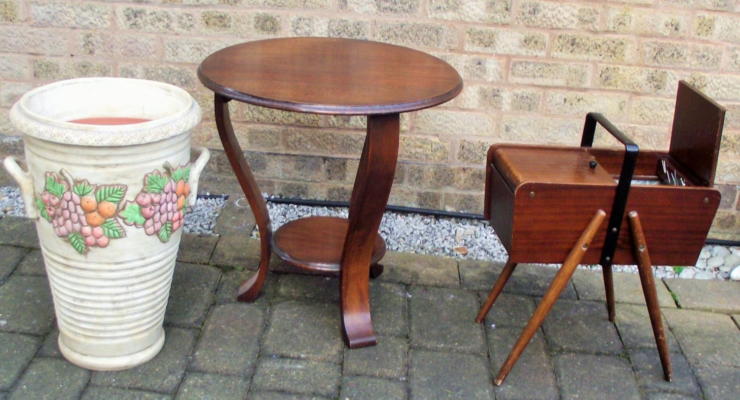 1930s oak circular side table with shaped legs + Vintage folding sewing box on slim tapering legs + Terracotta painted garden urn