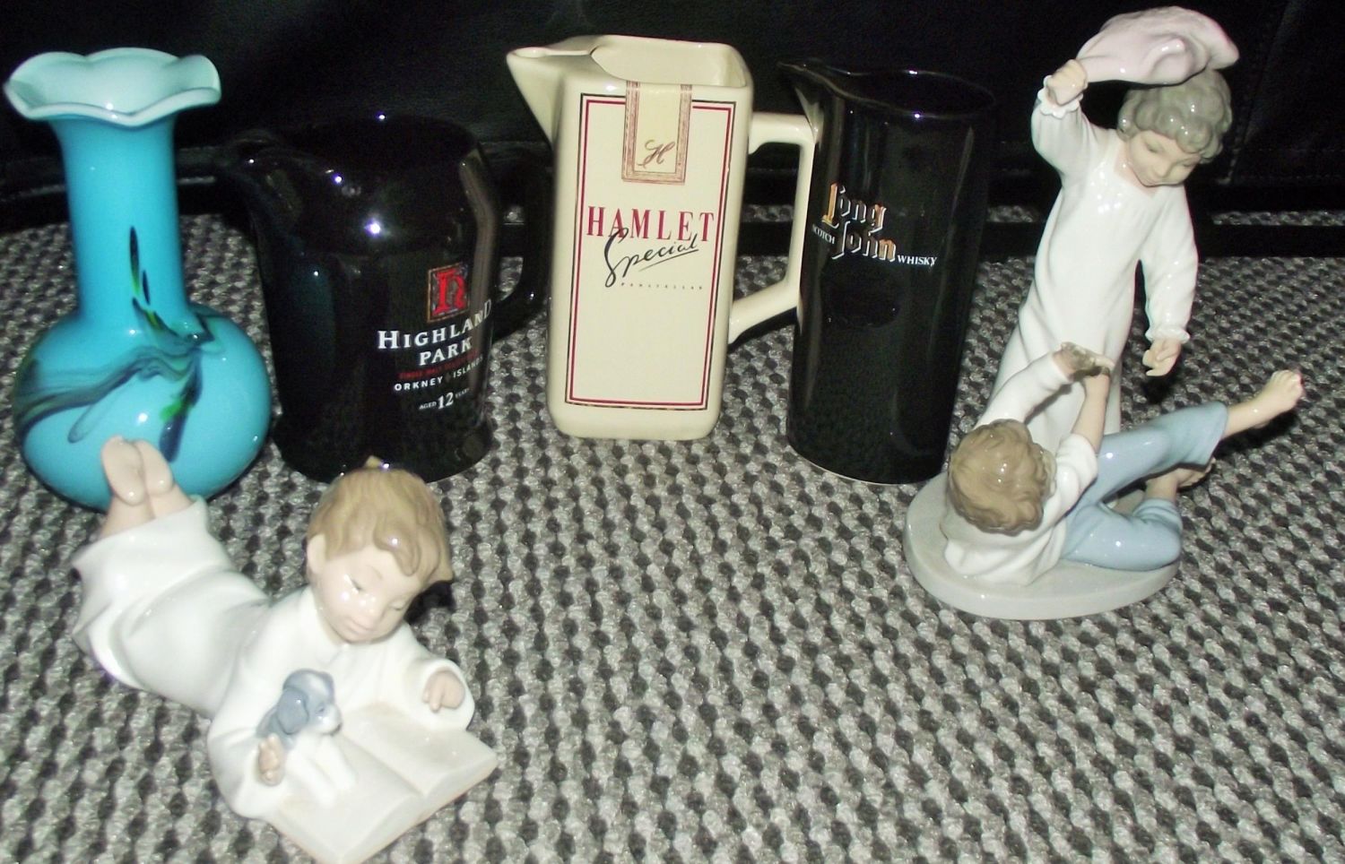 2 x large Nao figurines ( children pillow fighting and child reading book to a puppy + 3 collectible Whisky water jugs Highland park , Long john , Hamlet special + vintage blue overlay glass flare topped vase