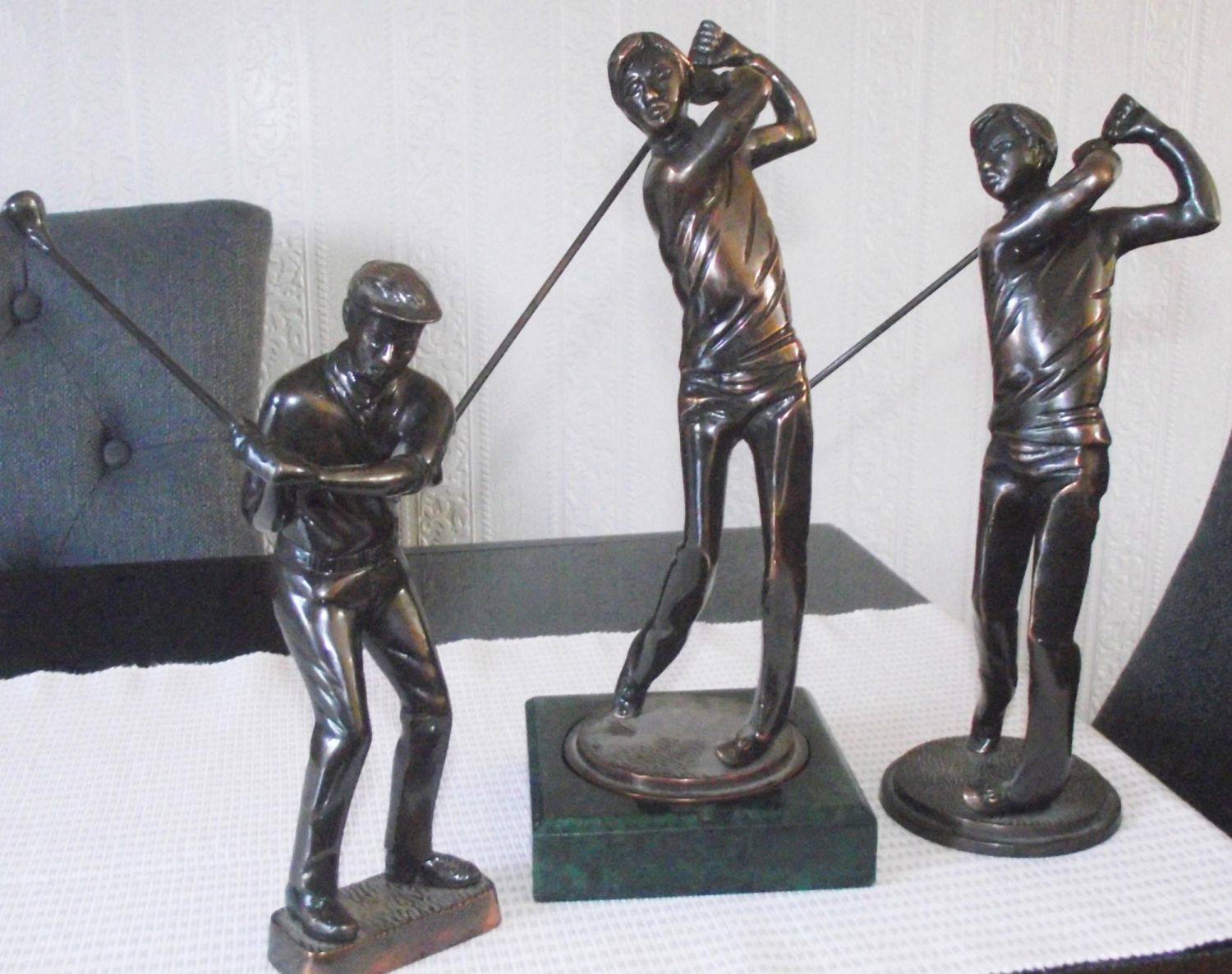 3 x cast metal Bronzed plated patinated golfing trophies, showing golfers in different poses during golf swing 1 on wooden marbled coloured base. All approx. 10 high