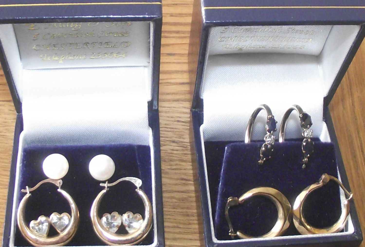 Pair of 9ct gold pearl stud earrings + pair 9ct gold half hooped love heart set half hooped earrings marked 375 + Pair of half hooped stone set earrings marked 375 + pair of shaped half hoop earrings marked 375 (4)
