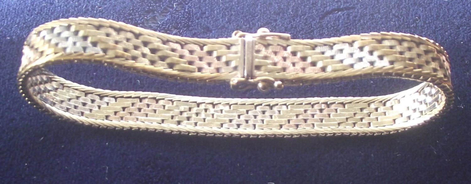 9ct gold articulated multi-colour gold bracelet with safety clasps 16.3g approx. 19cm fully open approx.