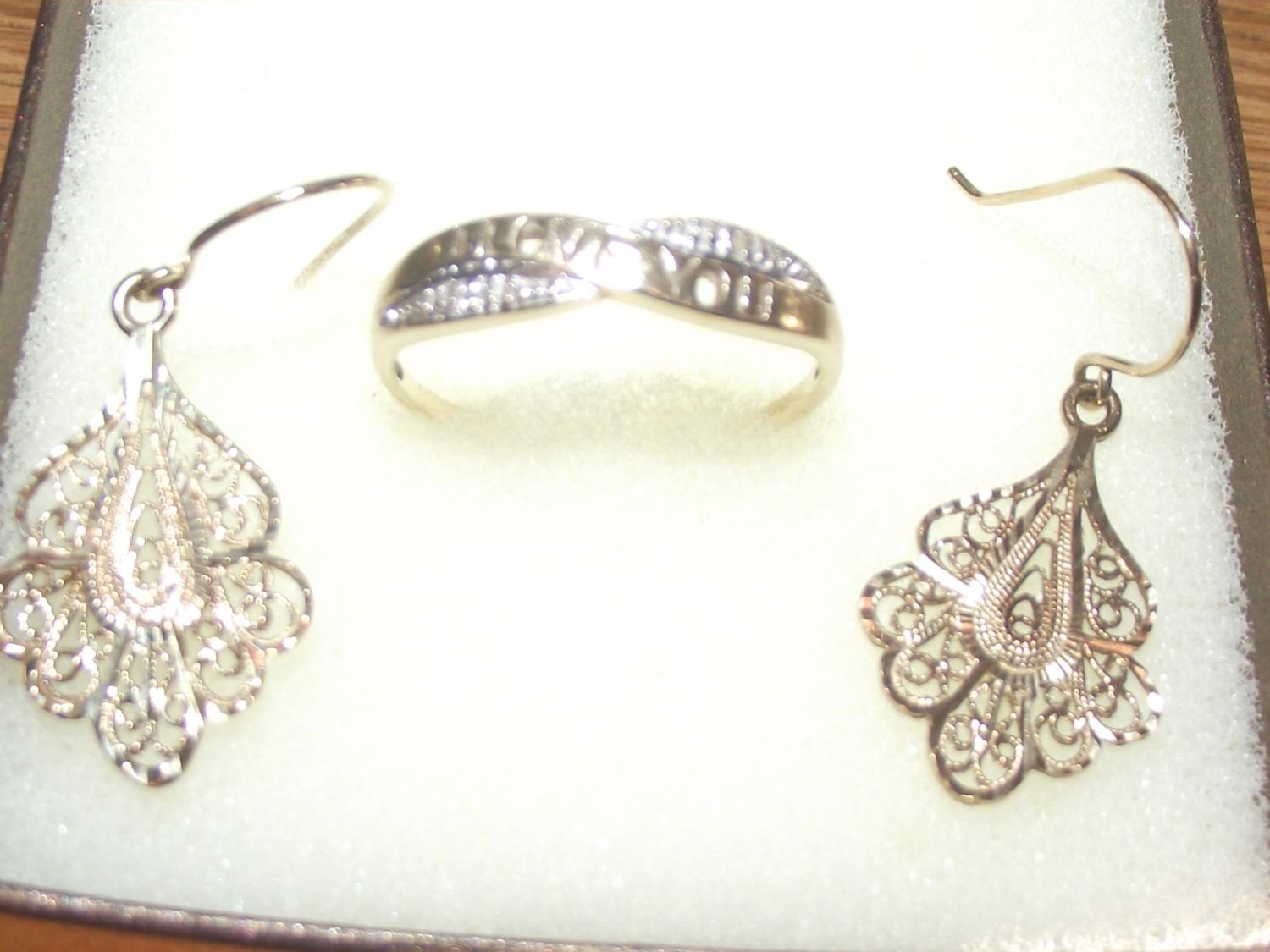 9ct gold ring ( I Love You) +pair of filigree earrings 9ct earrings 2.7g approx.