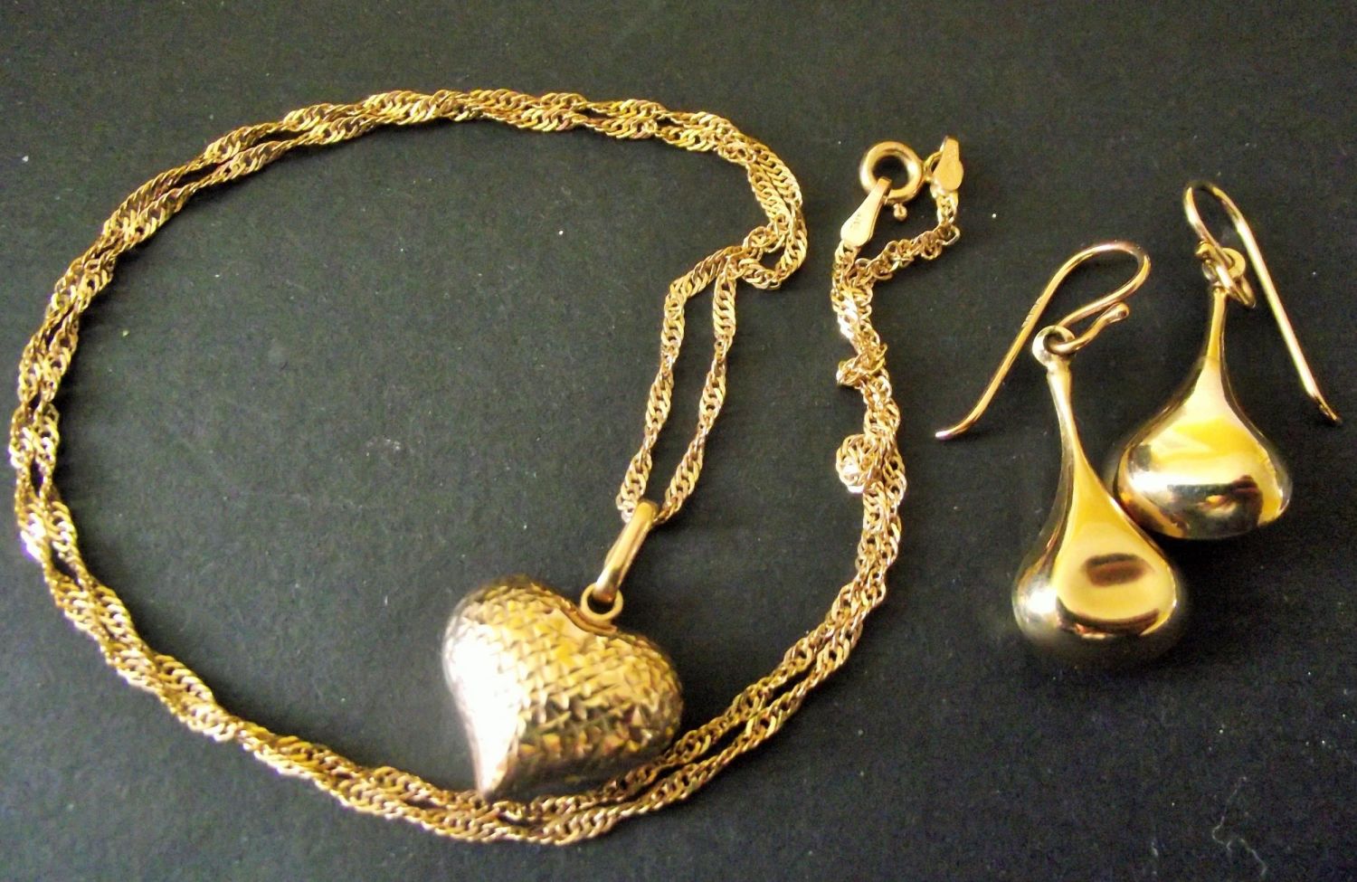 Ladies 9ct gold heart pendant on 9ct chain + pair of teardrop style 9ct earrings 4.3g approx.