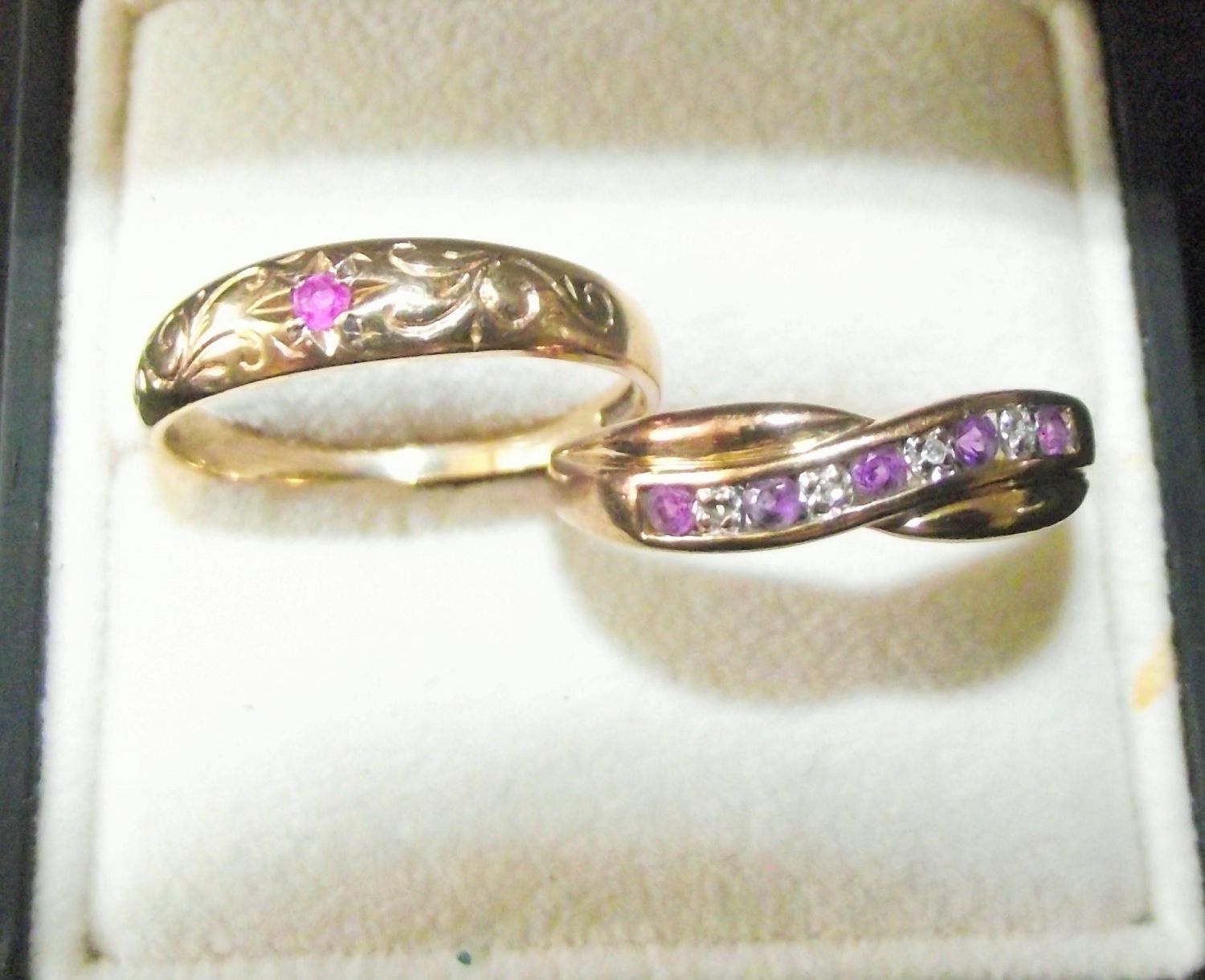 2 x good quality ladies 9ct gold rings 1 crossover set with diamond amethyst and 1 set with small amethyst central stone on engraved face 4.4 g approx. both size T