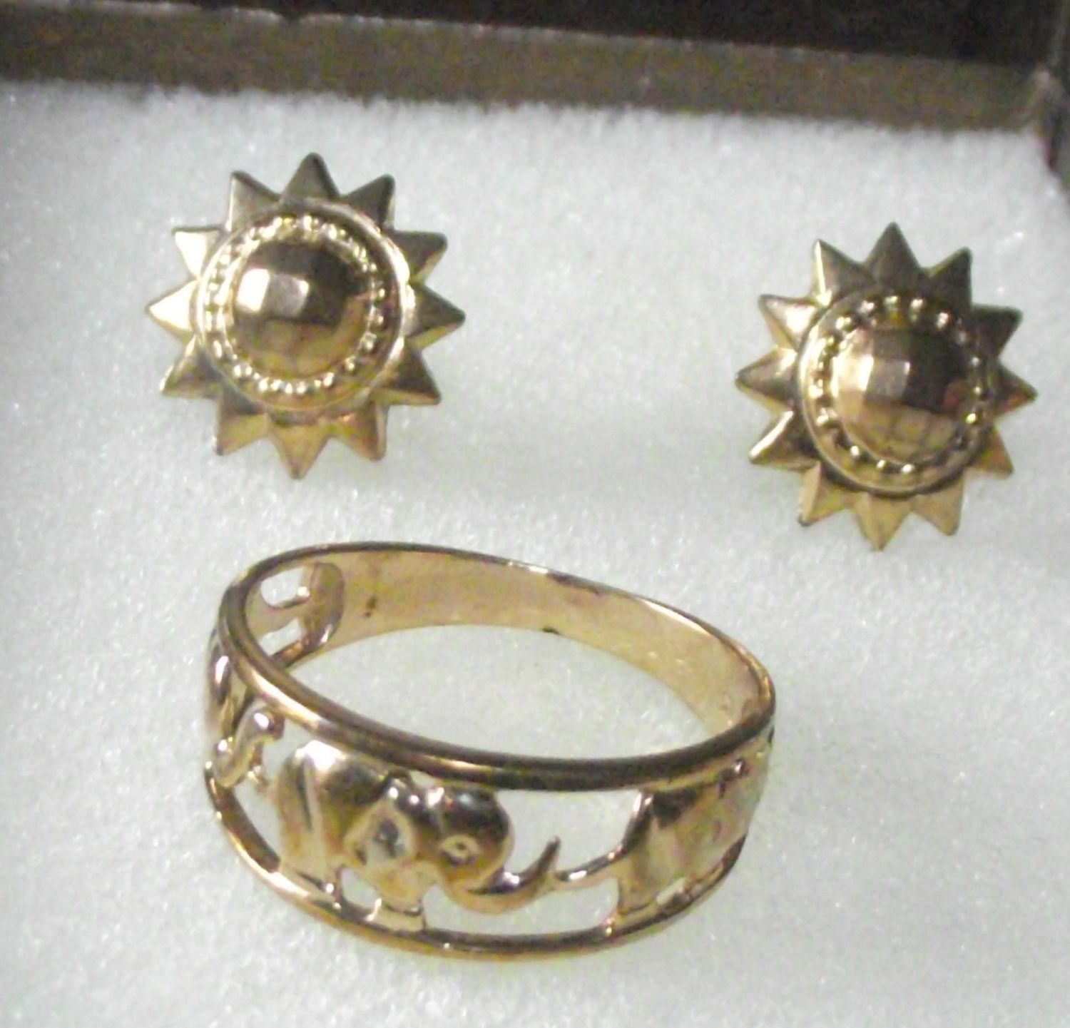 Elephant ring marked 9k + pair of 9ct earrings ( no butterfly backs) 3.0g approx.
