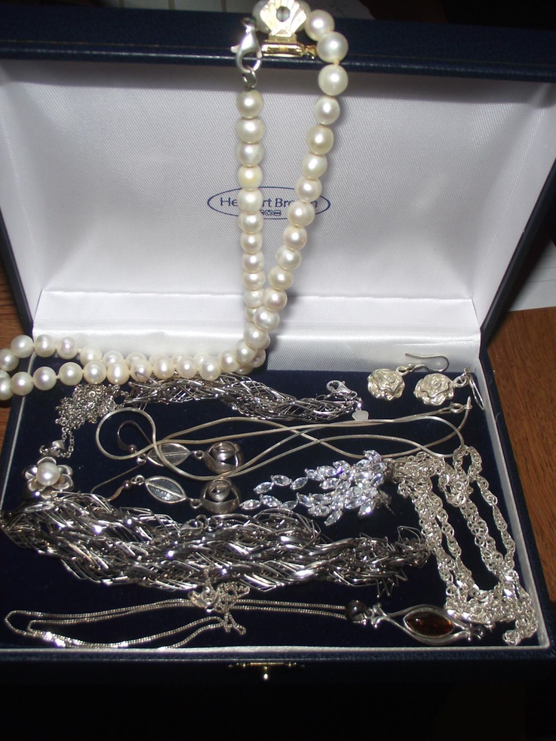 Good selection of silver jewellery inc necklaces , earrings , set of silver clasped pearls etc