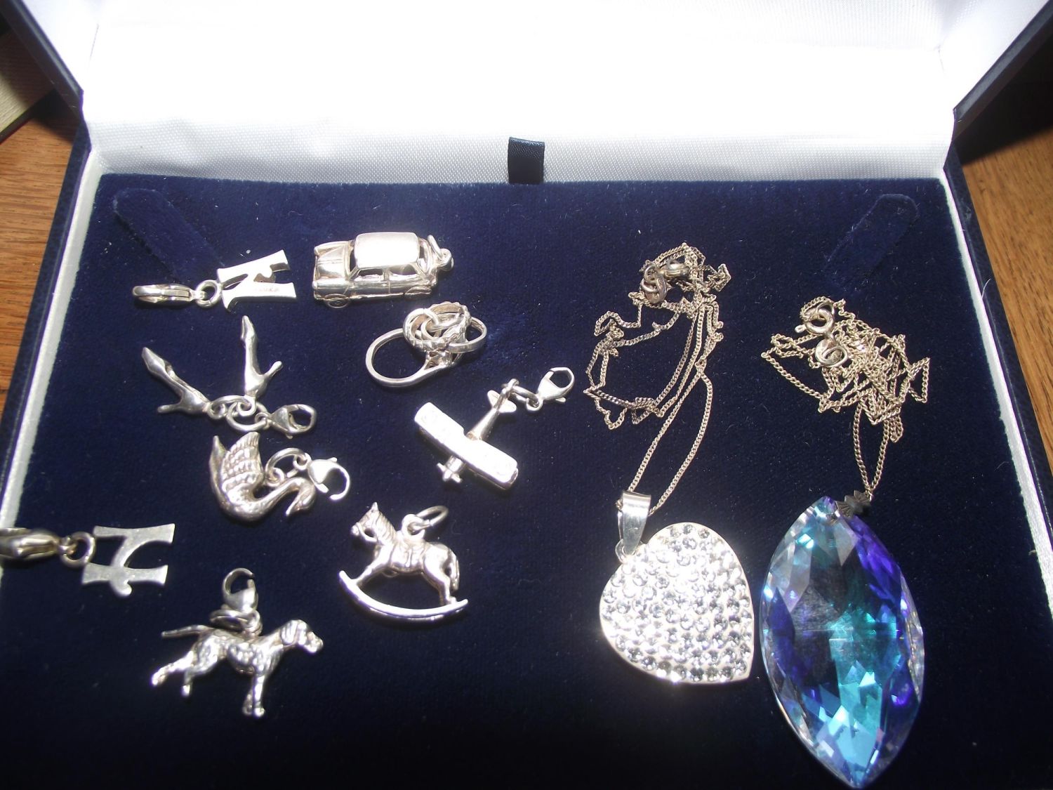 Small selection of silver clip on charms + silver diamante heart on silver chain + silver chain with crystal pendant