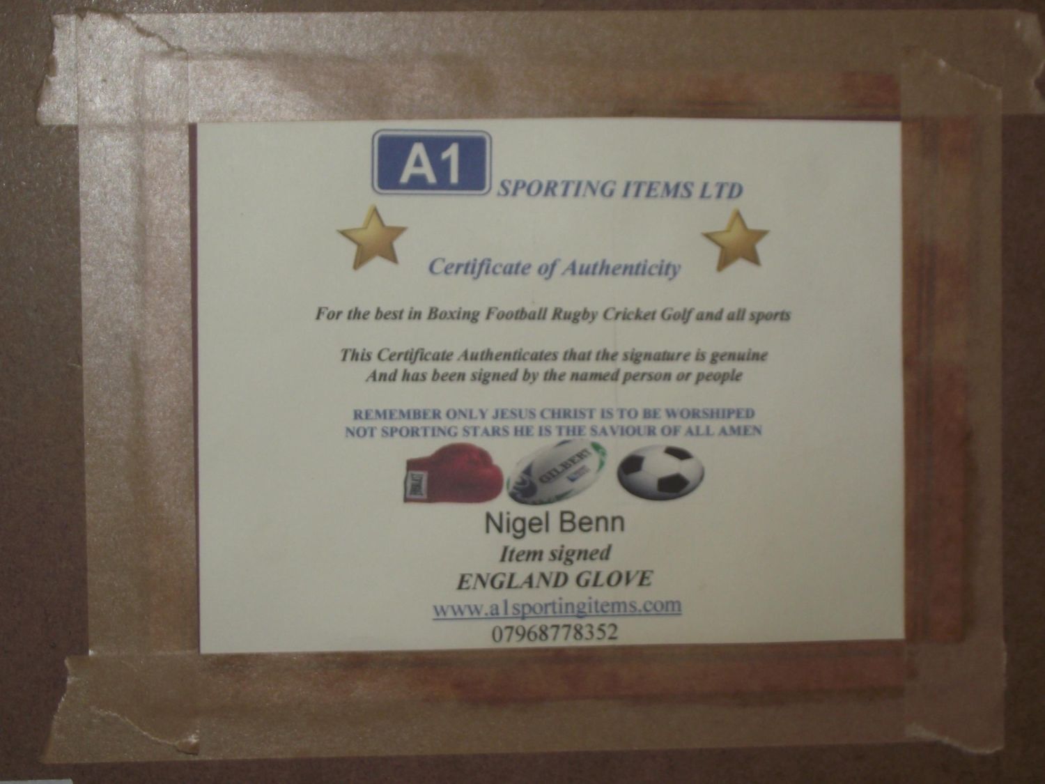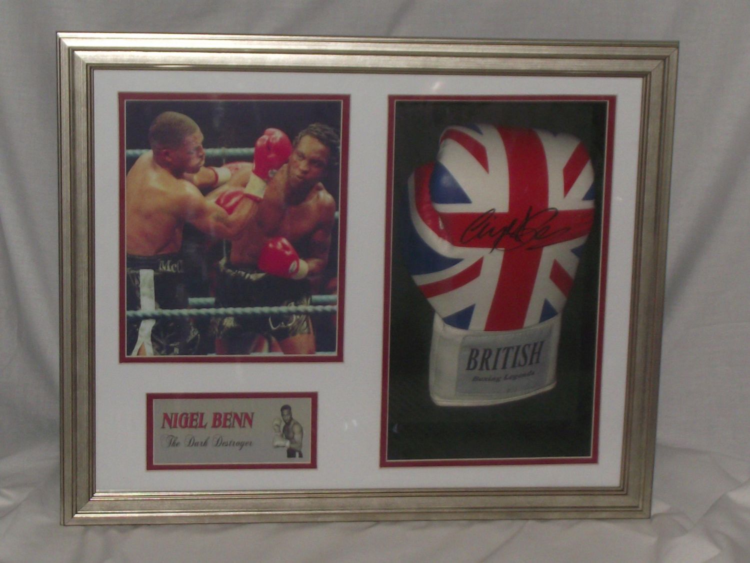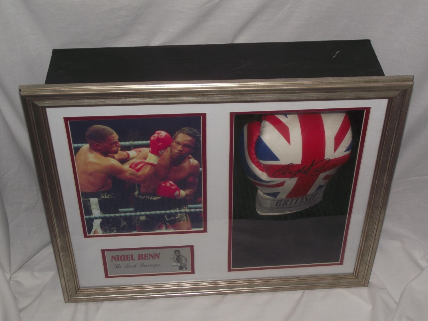 Box framed signed Nigel Benn boxing glove with picture and plaque The Dark Destroyer 18x22x6.5 A1 SPORTING ITEMS LTD approx