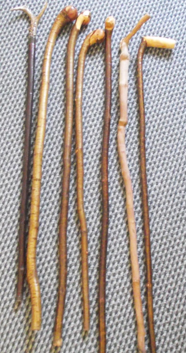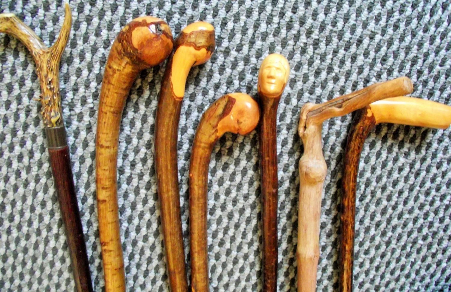 Nice selection of various Walking sticks Inc. some Irish shillelagh style sticks antler topped stick and 1 with a carved face in handle all approx. 39