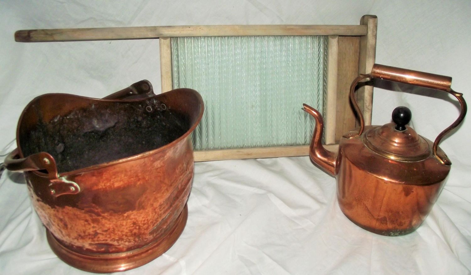 Vintage ripple glass wash washboard + copper scuttle + copper kettle