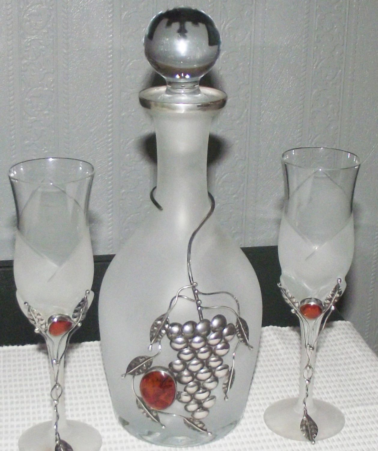 Studio Glass 12 decanter & 2 wine glasses Frosted Glass Sterling Silver & Baltic Amber grapevine design