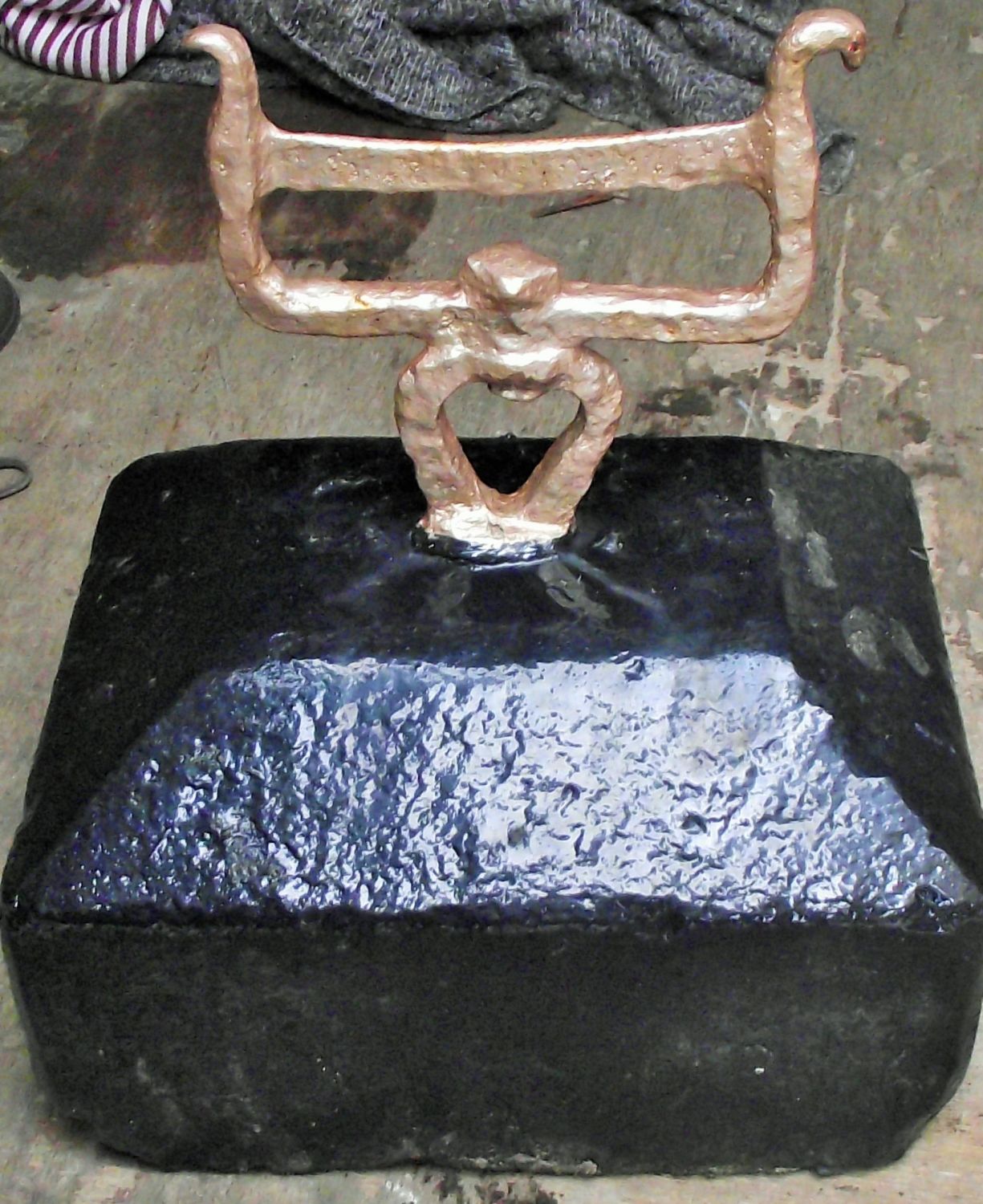 Antique wrought iron boot scraper (painted) mounted in heavy substantial shaped concrete base