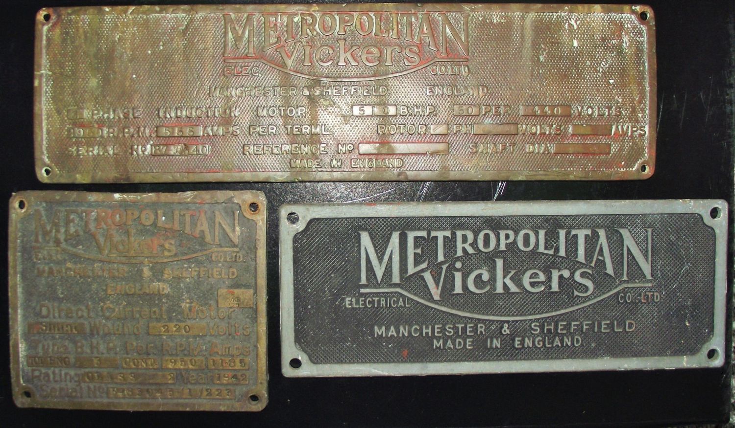 Vintage brass Metropolitan Vickers 3 Phase induction motor plaque +Steel metropolitan vicker direct current motor shunt wound 220 volts plaque + Alloy Metropoltan Vickers electrical co ltd plaque (3)