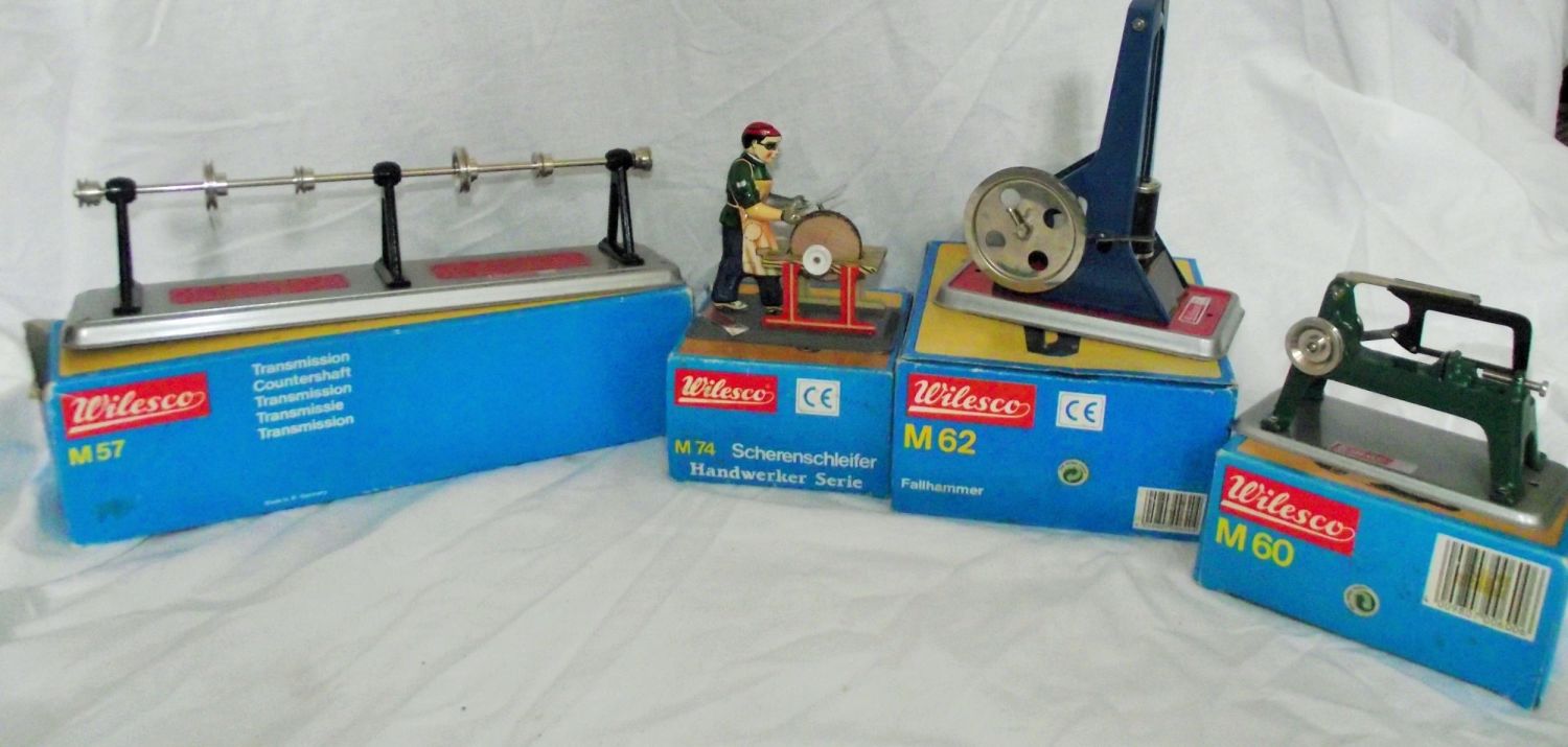 4x Wilesco models live steam accessory models M60 forest classic hacksaw, M74 Shears grinder ,M62 drop hammer lifted by a traction rope, M57 large counter shaft transmission models all in original boxes all near mint condition