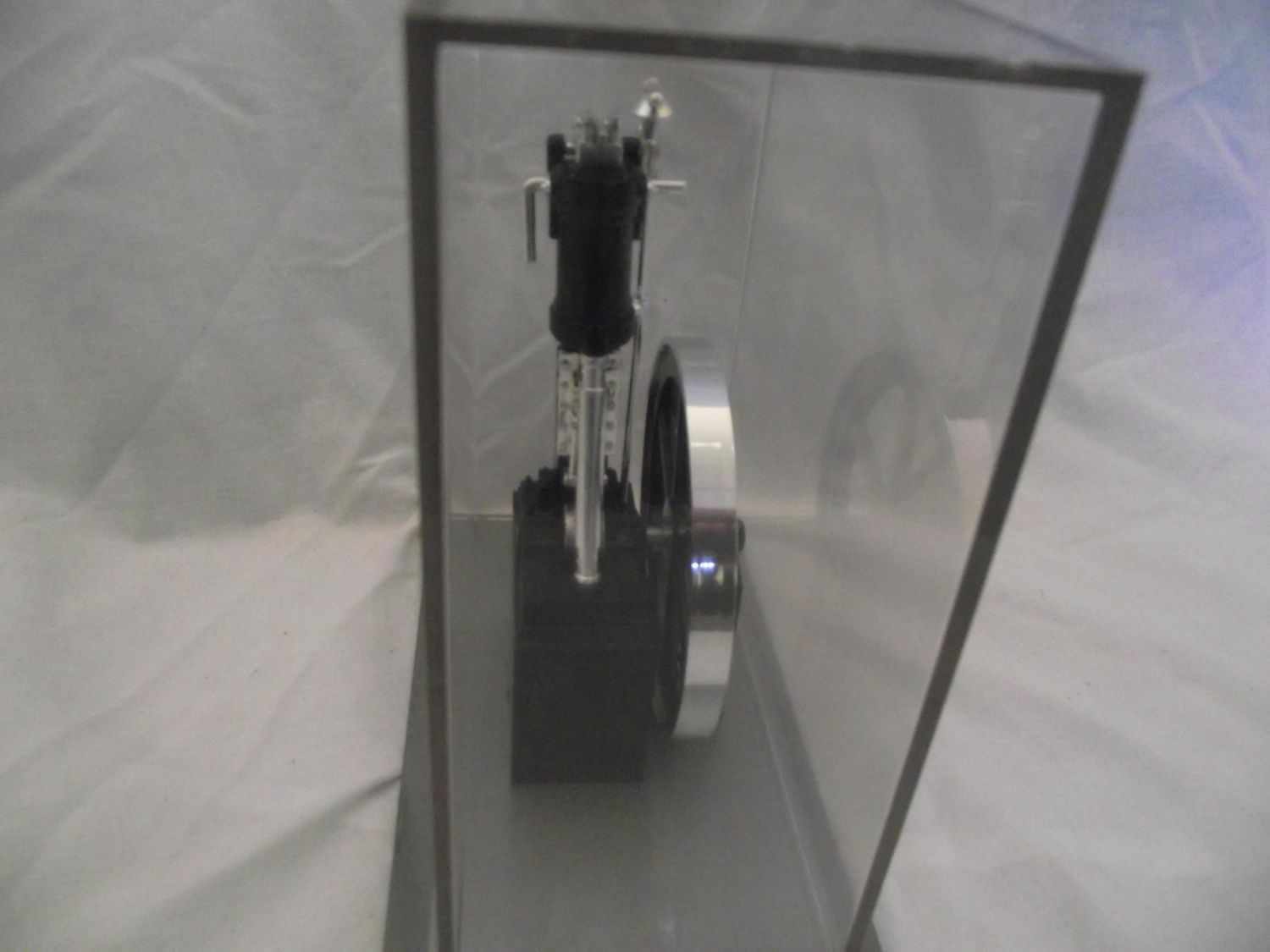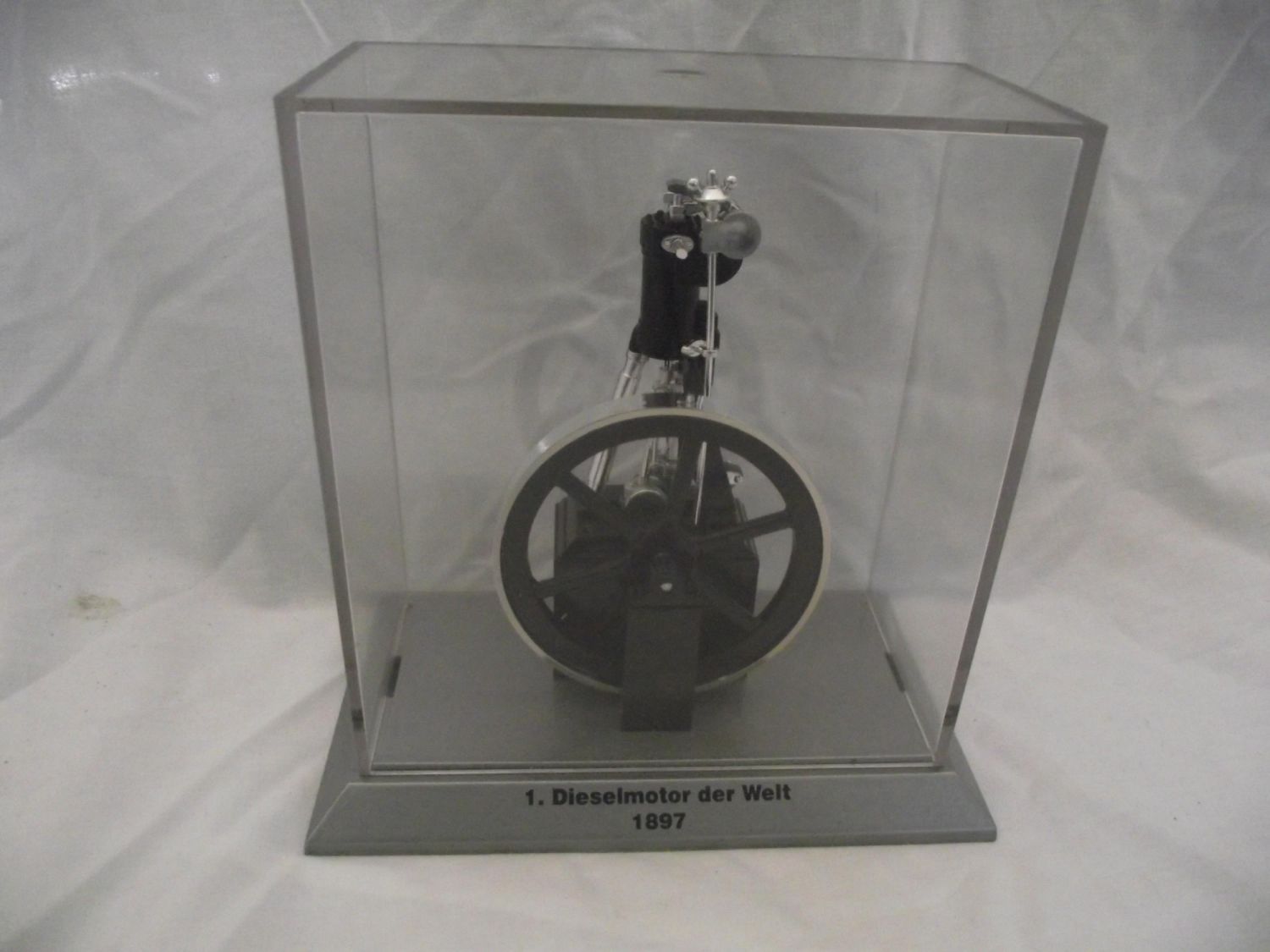 Replica model of the MAN diesel engine from 1897 – Model on presentation base with showcase cover – Flywheel and cylinder all moveable