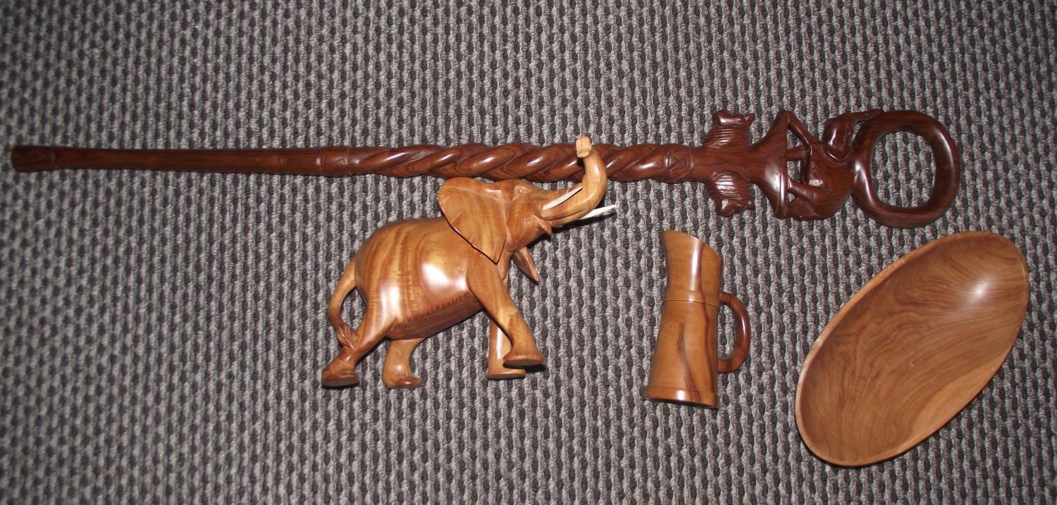Mixed lot Treen items Inc. Carved Elephant, carved walking stick with loop handle , carved bowl & jug