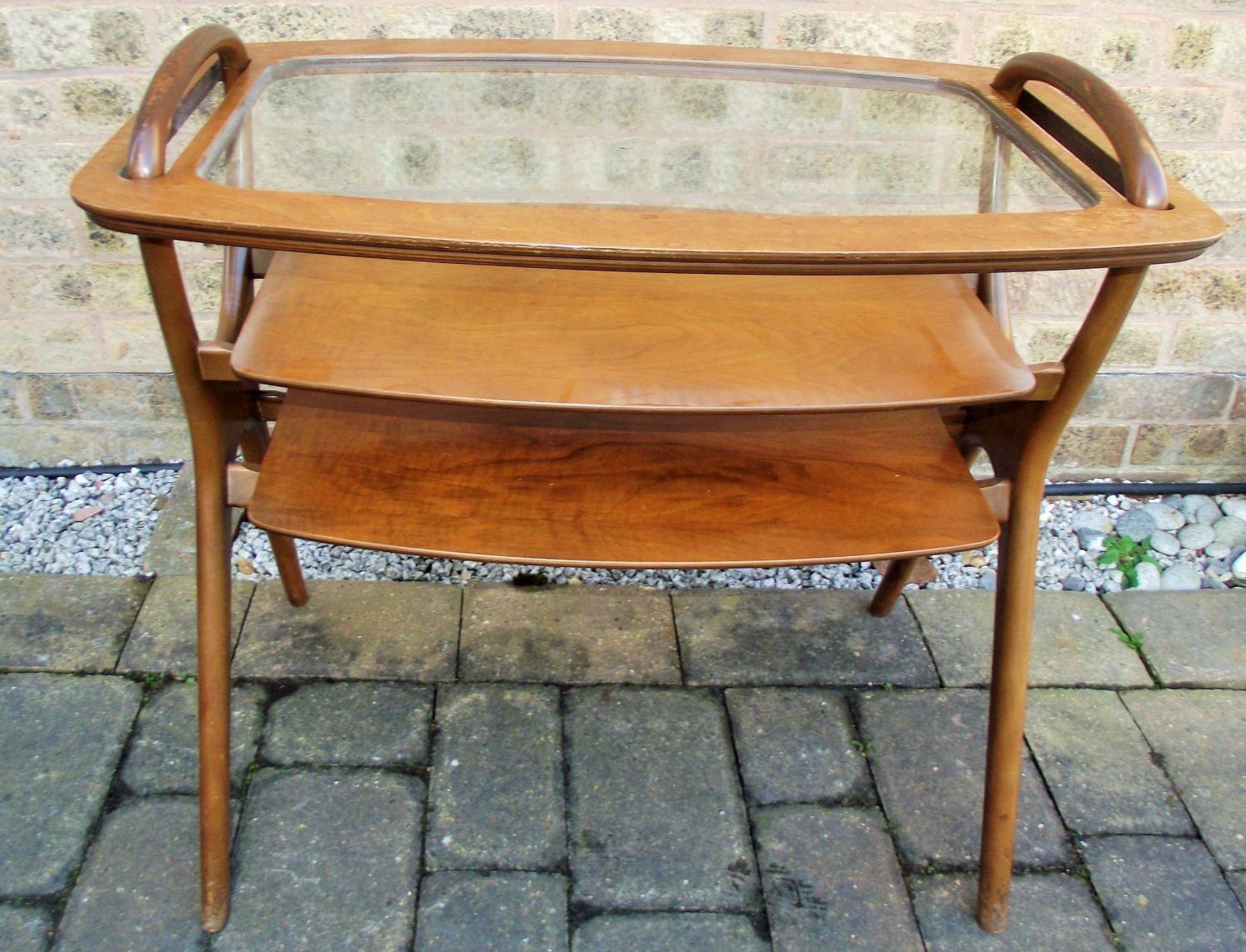 1950s Rare butlers table / tray. Beautifully shaped light colour bentwood frame with wooden edged glass tray,. There are two fixed shelves underneath. The whole table and tray can be carried by the looped handles of the frame, and the glass tray can be carried on its own by the cut out handles that fit over the looped ones. Design by Malcolm Walker for Dalescraft.