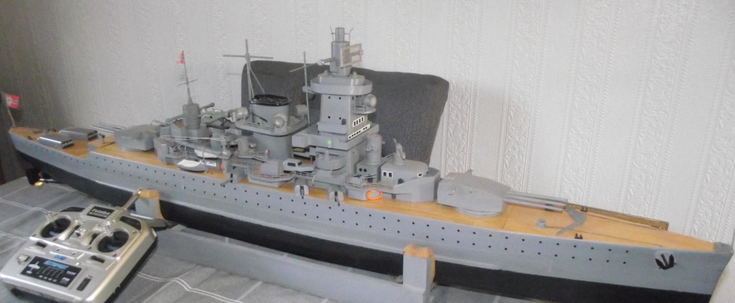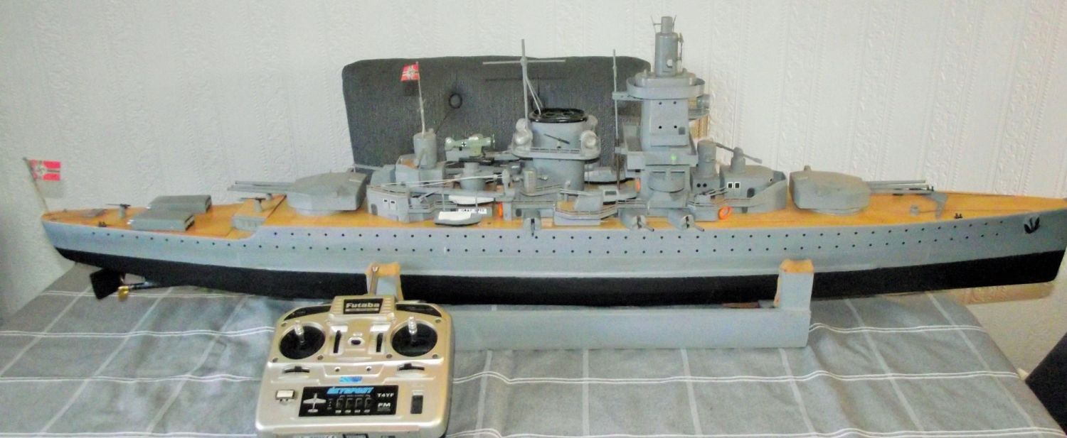 Scratch built model Boat famous warship Graf Spee . Built from balsa & plywood. Powered by 2 r370 motors main drive batteries are 2x 7.2 volt N/HM . controlled via Futaba 4 channel transmitter receiver on 40.915 m/cycles ( working )Approx 50 long 4 deep hull