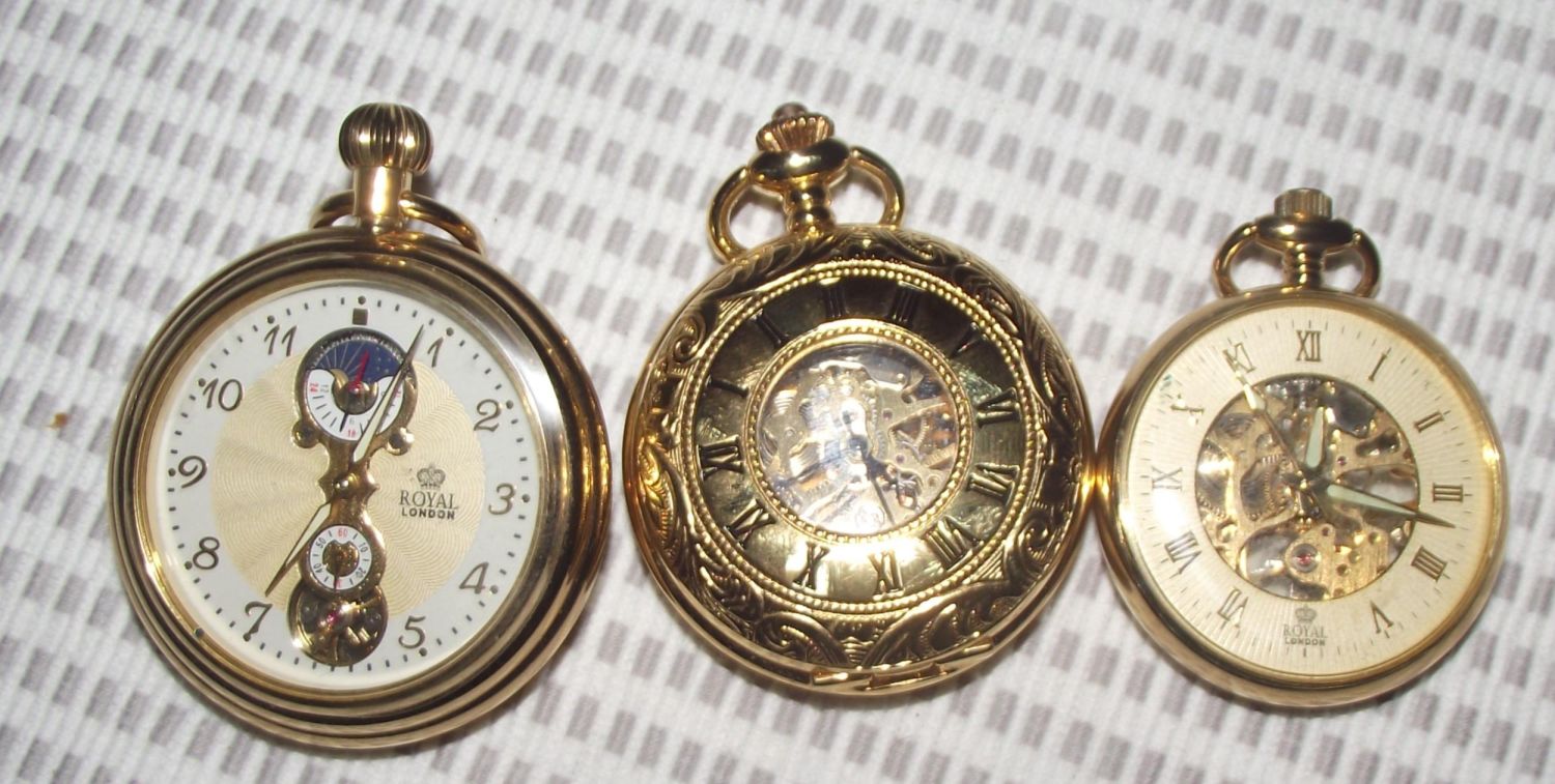 3x nice plated cased pocket watches Inc. 2x keyless Royal London pocket watches + Fox & Simpson keyless half hunter (all working )