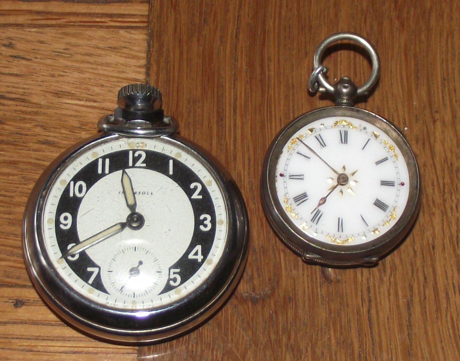 Silver ladies fob watch ticking when wound missing glass + stainless steel Ingersoll pocket watch seen ticking