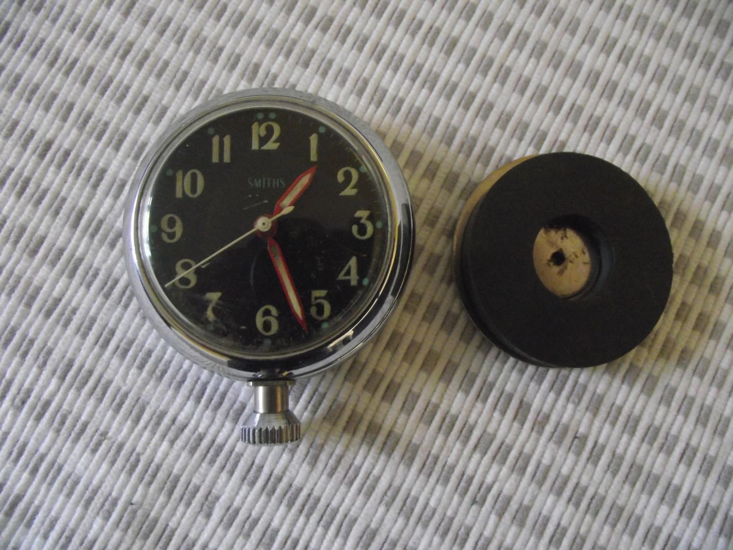 Rare 1950s Smiths car dashboard pocket watch with round magnetic disc and winder in upside down position ( seen ticking )