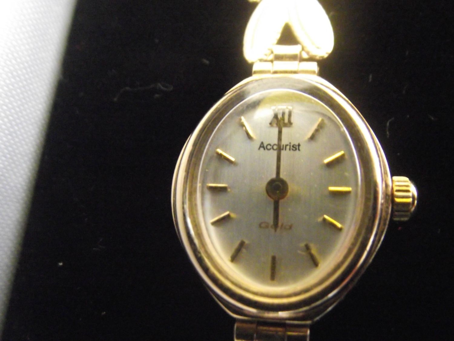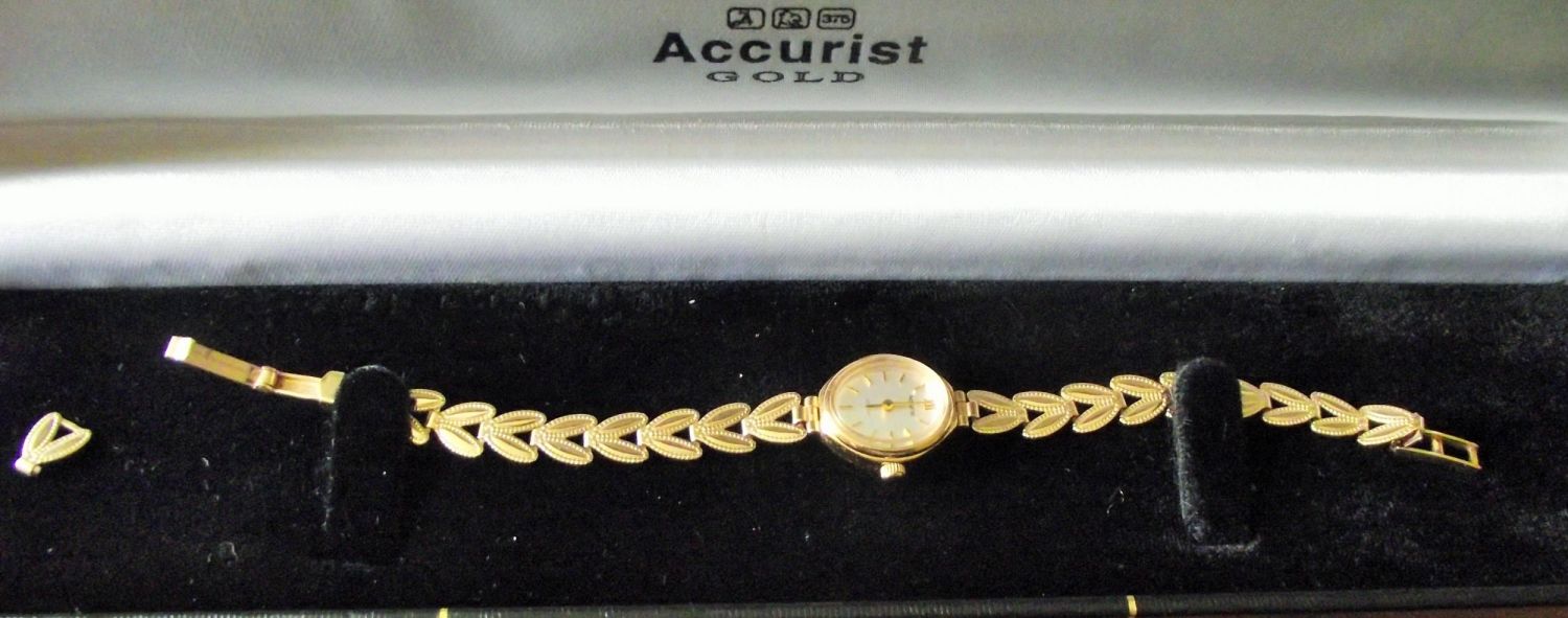 A modern 9ct gold Accurist quartz ladies cocktail watch on 9ct gold bracelet strap. (With 1 Extra link piece ) Boxed. Working 10g approx.