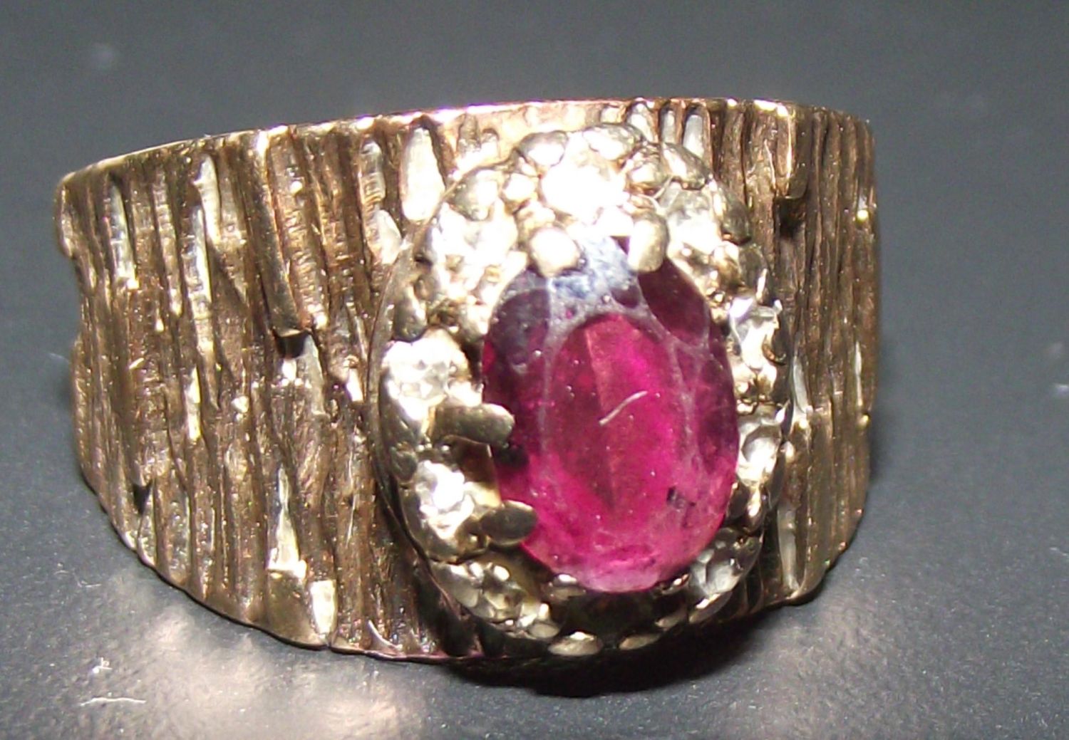 Retro 1970s 9ct Gold Garnet & Diamond Bark Effect Ring size I 4.3g approx.
