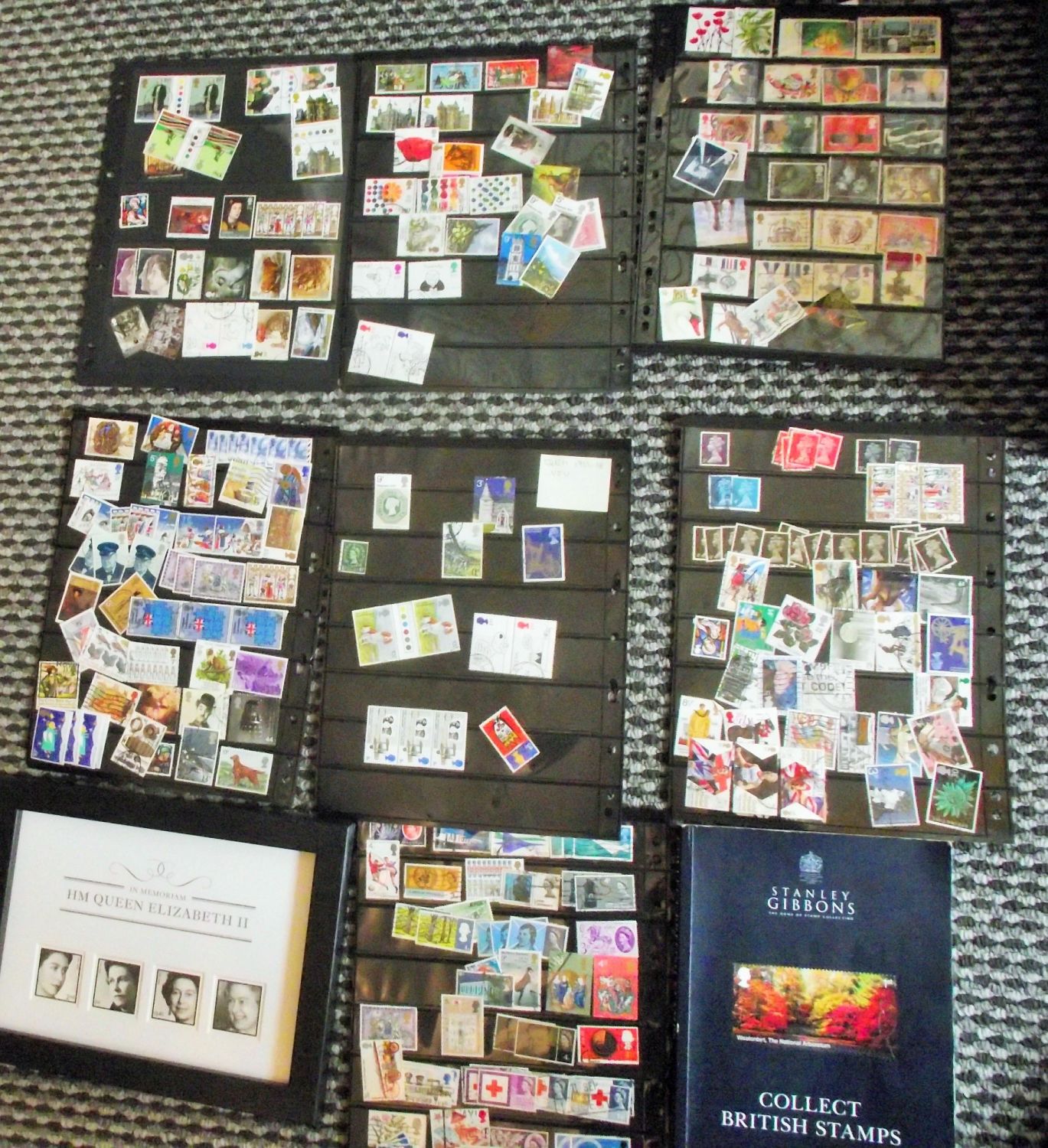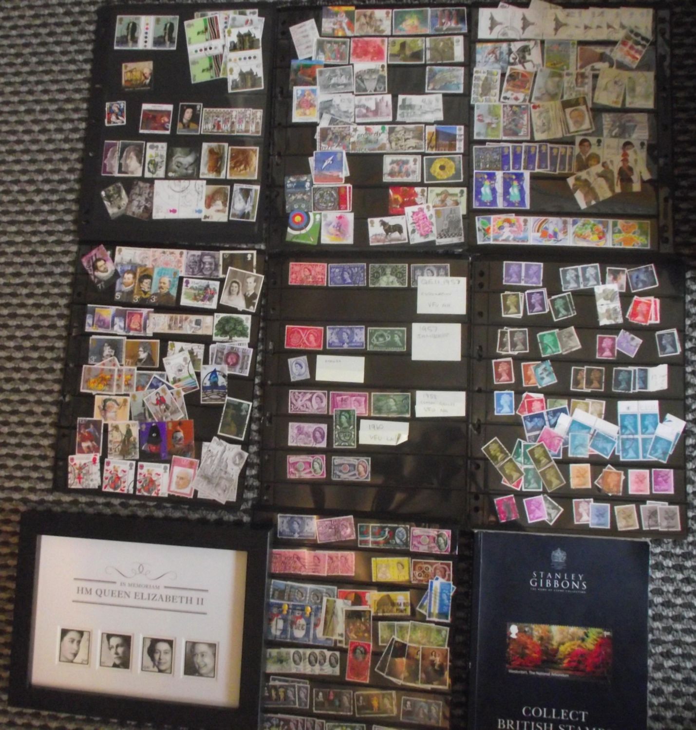 6x double sided +1 single sided album sheets of assorted British stamps + Stanley Gibbons 2020 edition stamp catalogue book + framed Royal Mail Presentation Pack In Memoriam HM Queen Elizabeth II + Stanley Gibbons book