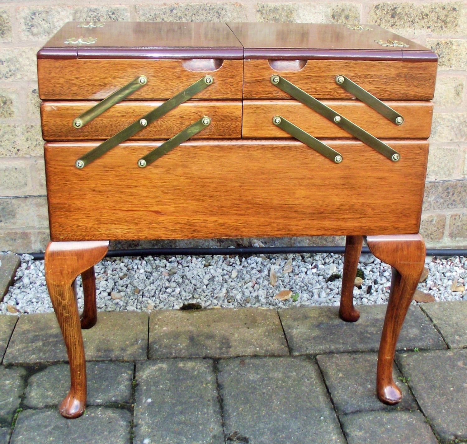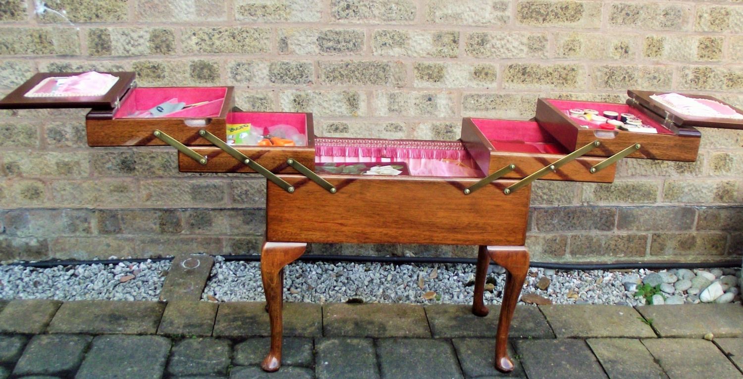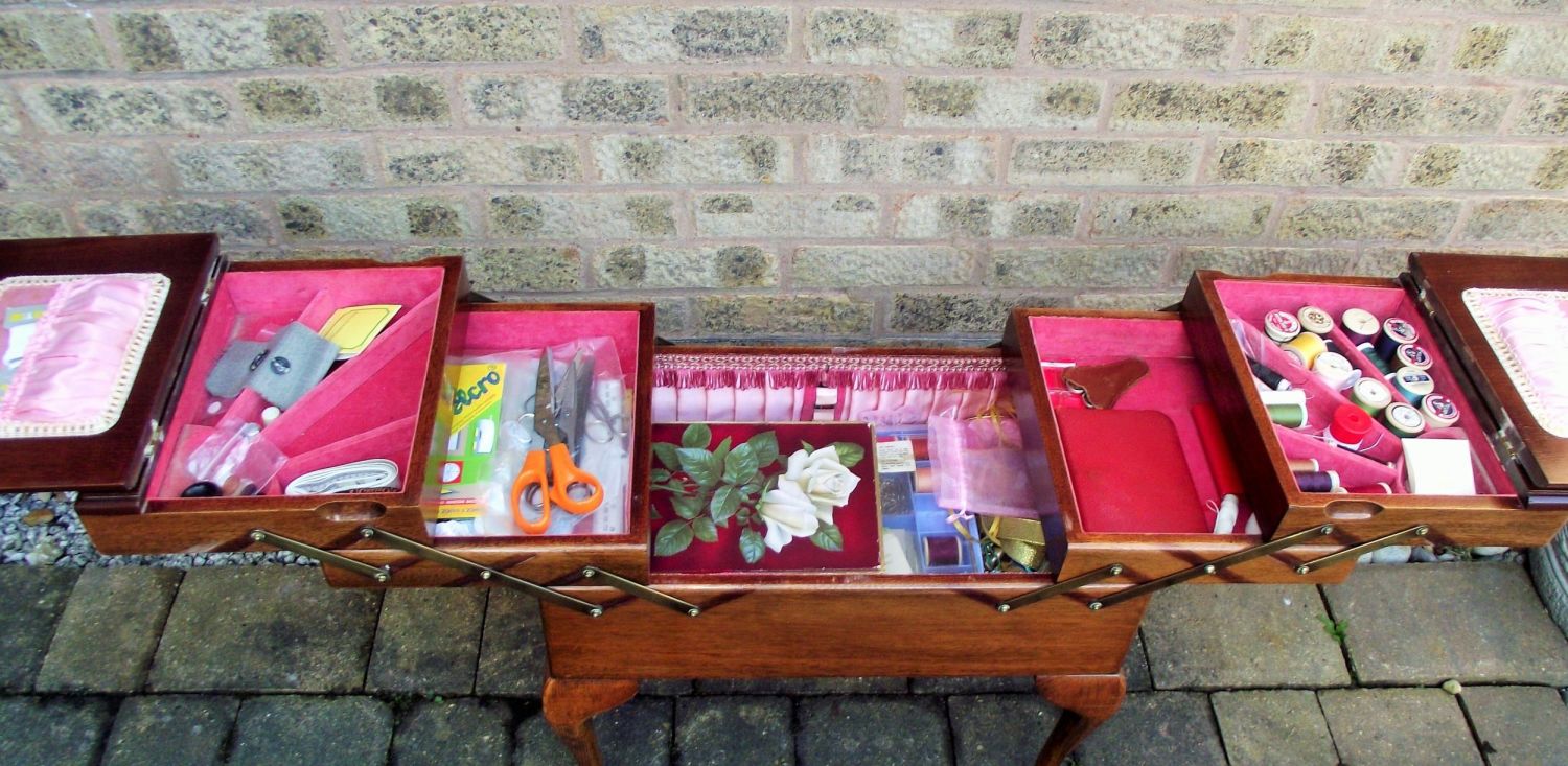 Lovely high quality oak mid-century cantilever Sewing box with all quality brass fittings interior lined + contents in superb condition