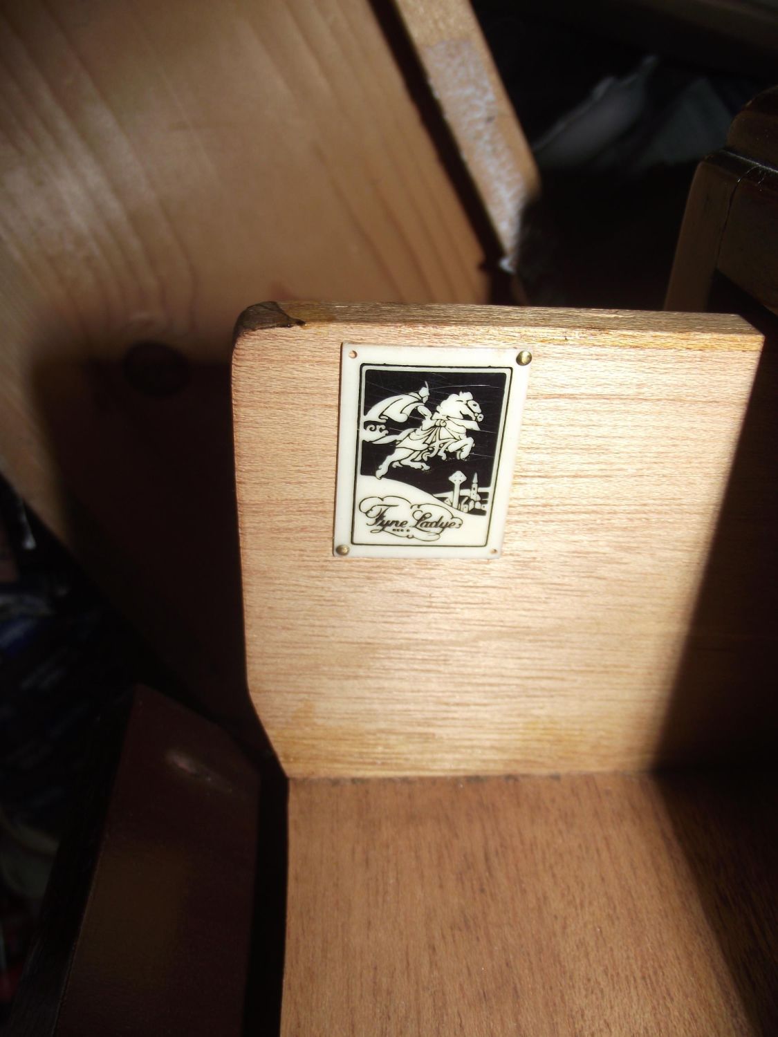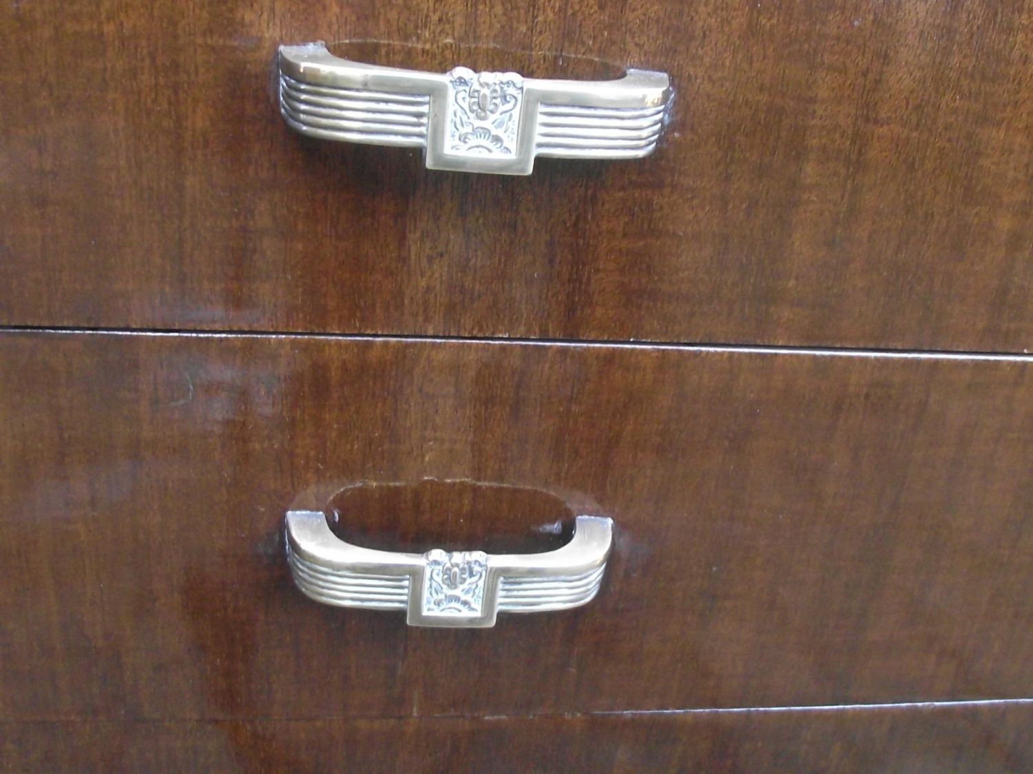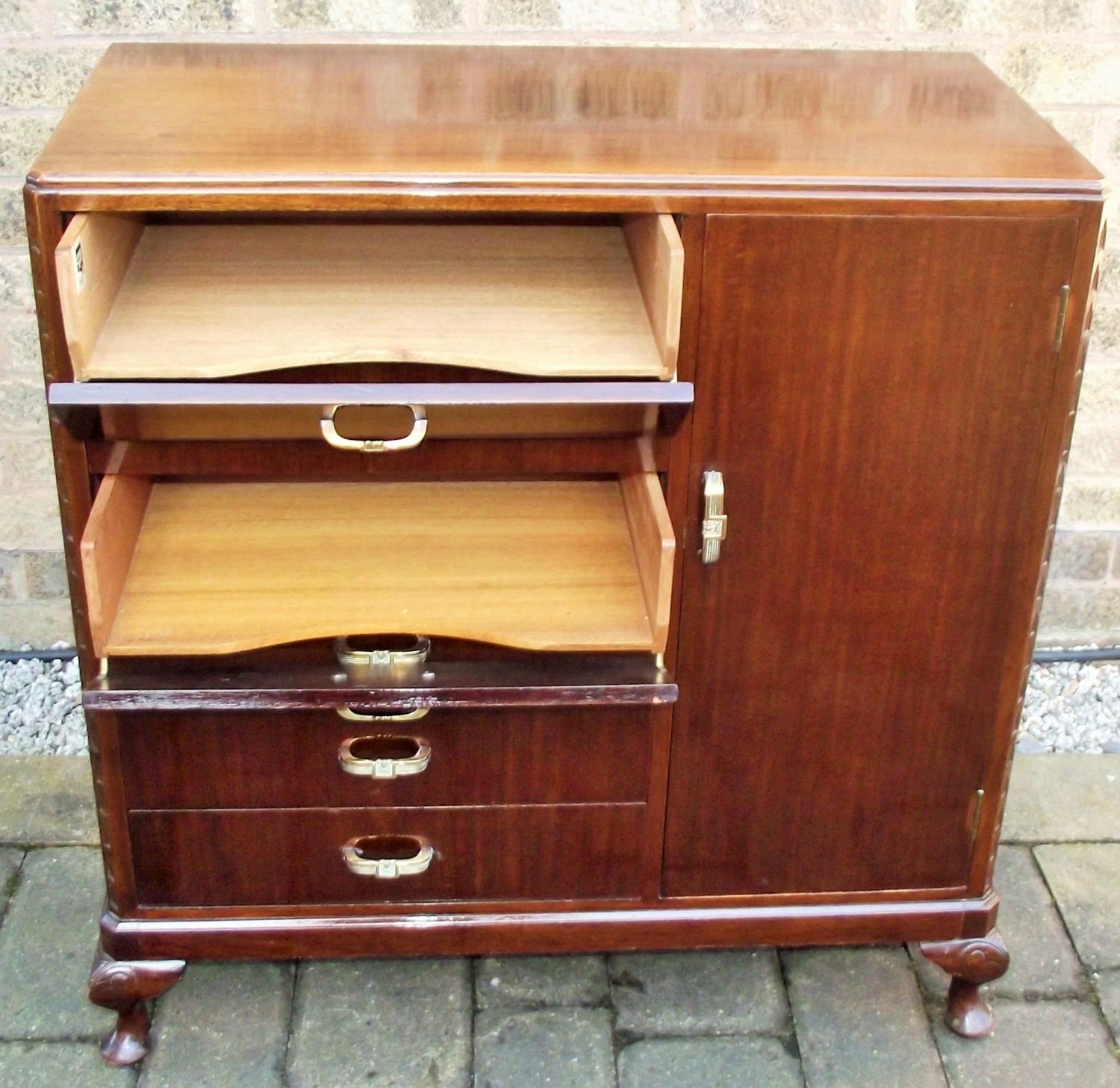 Art Deco style 6 draw 1 door Music sheet cabinet with brass deco handles designed by Richard Hornby for Fyne Ladye furniture retailed by Wilson Peck Fargate Sheffield. (Fyne Ladye furniture was sold mainly in Heals and Harrods of London) Fyne Ladye plaque & retailers stamp on draws.