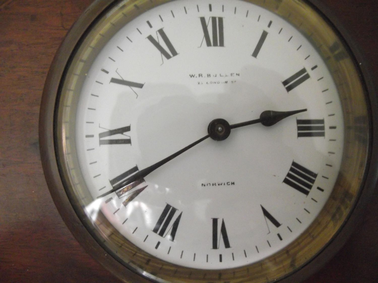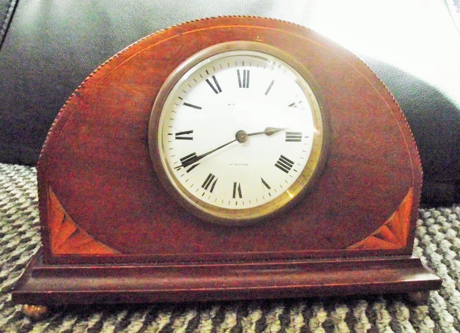 Lovely Edwardian inlaid mantle clock raised on small brass bun feet , French movement ,signed on dial W.R .Bullen London st Norwich (with key) seen working