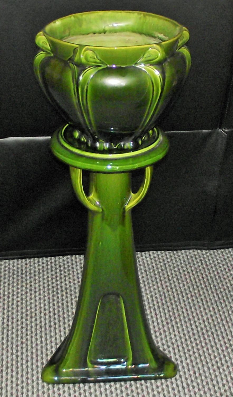 A Bretby Arts and Crafts style jardinière and stand with green tin glaze, pedestal height 60 cm, jardinière 23cm marked underside. In good overall condition.