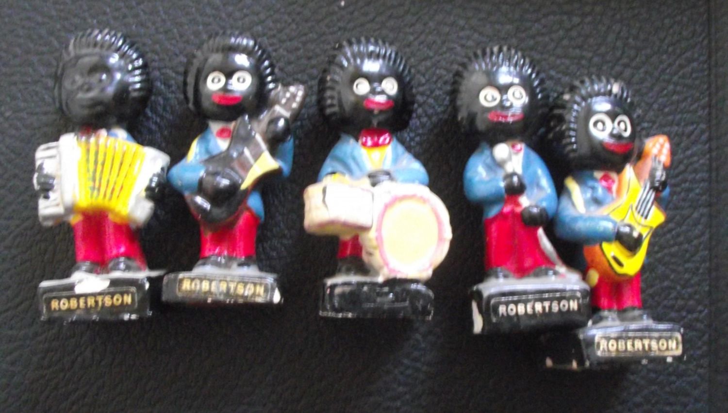 A set of five vintage retro Robertson golly advertising band figurines each being hand painted holding musical instruments on square plinth bases. Measures 7cm high.