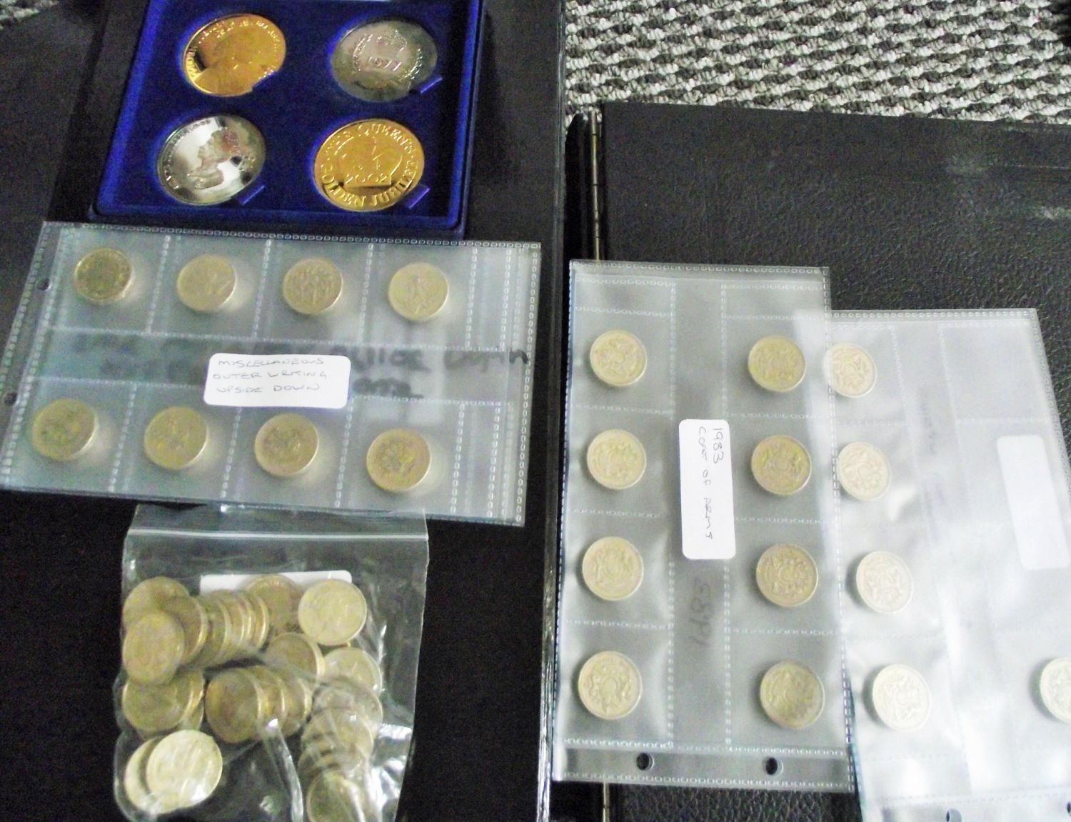 Queen Elizabeth gold plated and silver plated jubilee ltd edition 1977/ 2002 proof coins with certificate + 55 old £1 coins in sleeves & loose