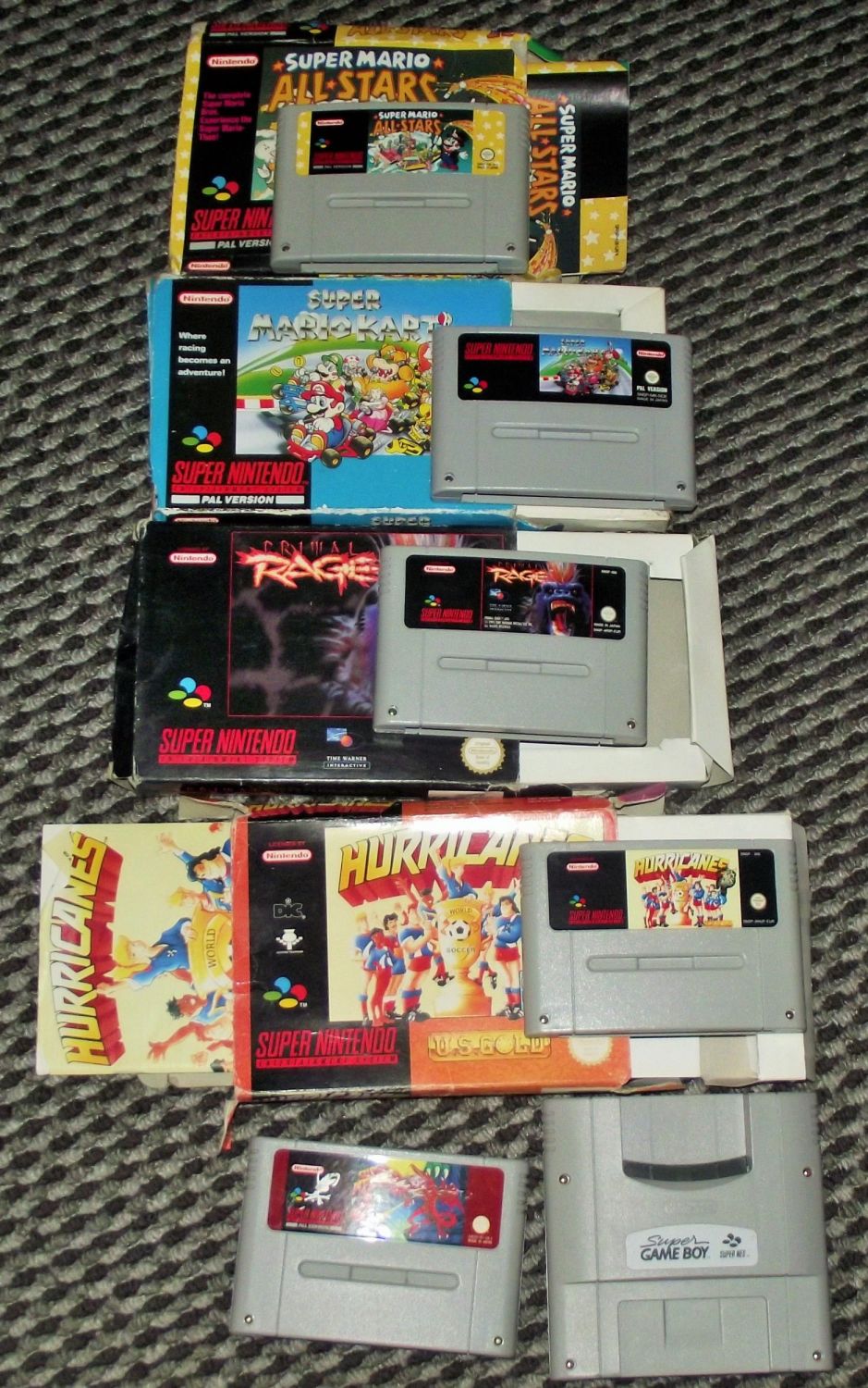 5 x Vintage Nintendo games inc. Super Nintendo Hurricanes World Soccer. Super Mario All-stars .Super Mario Kart. Super Nintendo Primal Rage with boxes + Super Nintendo Super Metroid ( no box)